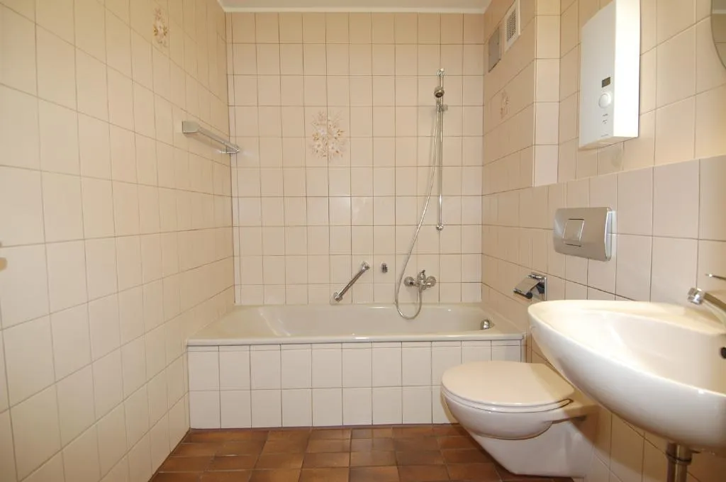 Das Badezimmer ist raumhoch gefliest und mit einer Badewanne ausgestattet.