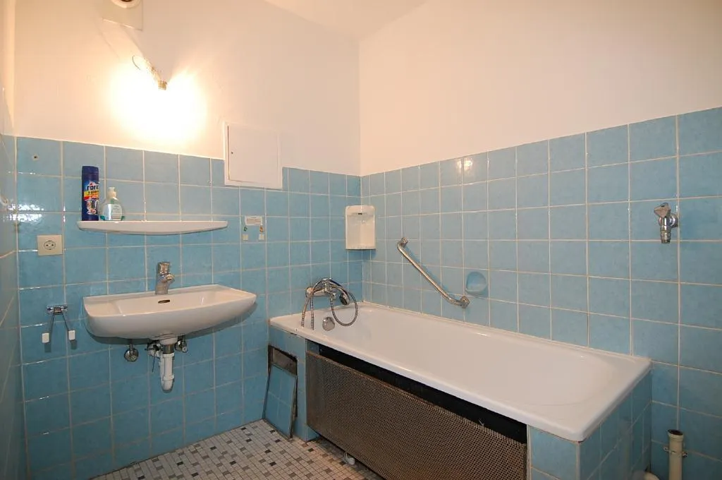Das Badezimmer ist halbhoch gefliest, mit einer Badewanne und mit einem Waschmaschinenanschluß ausgestattet.