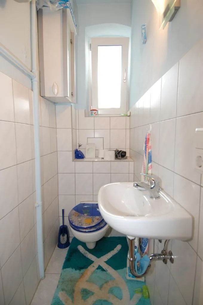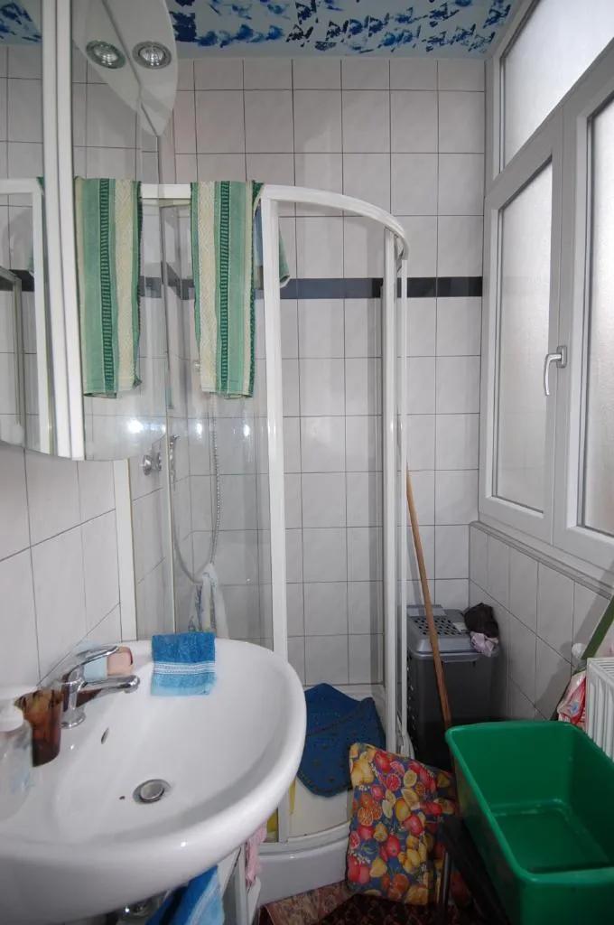Das angrenzende Duschbad ist raumhoch gefliest und verfügt über Fenster. Es wurde ca. 2004 in der ehemaligen Veranda eingebaut.