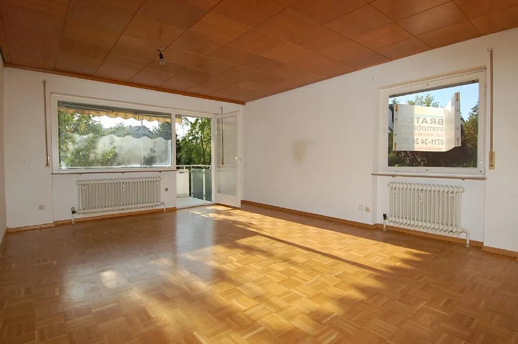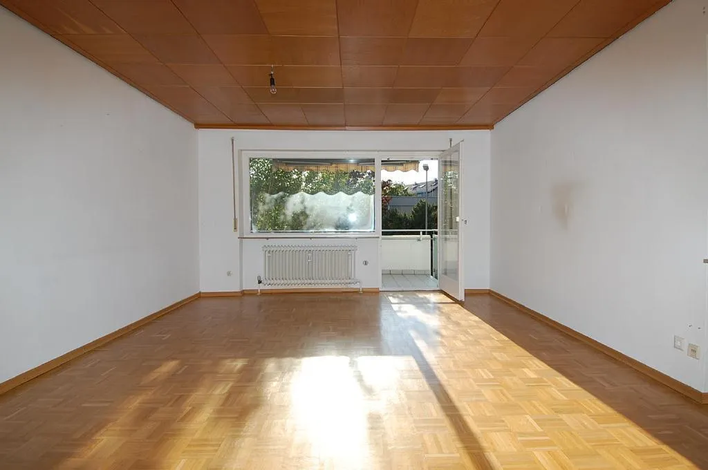 Das ca. 25 m² große Wohnzimmer ist nach Norden und Westen ausgerichtet und verfügt über Eiche-Parkettboden und eine Holzdecke.