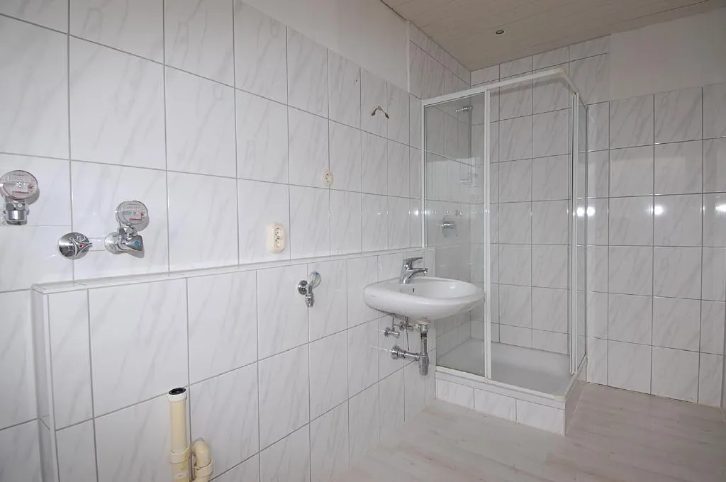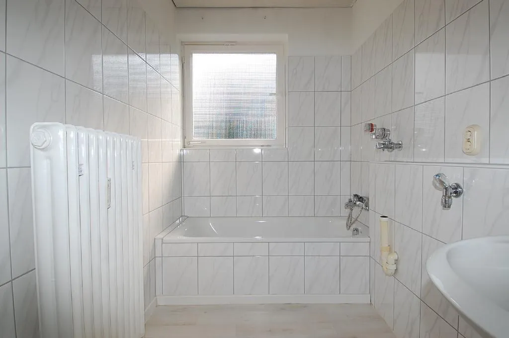 Das Tageslicht-Bad wurde 2008 modernisiert. Es ist halbhoch gefliest und mit Laminatboden, Badewanne, Dusche, Waschmaschinenanschluss, Decken-Einbauleuchten und einem Fenster ausgestattet.