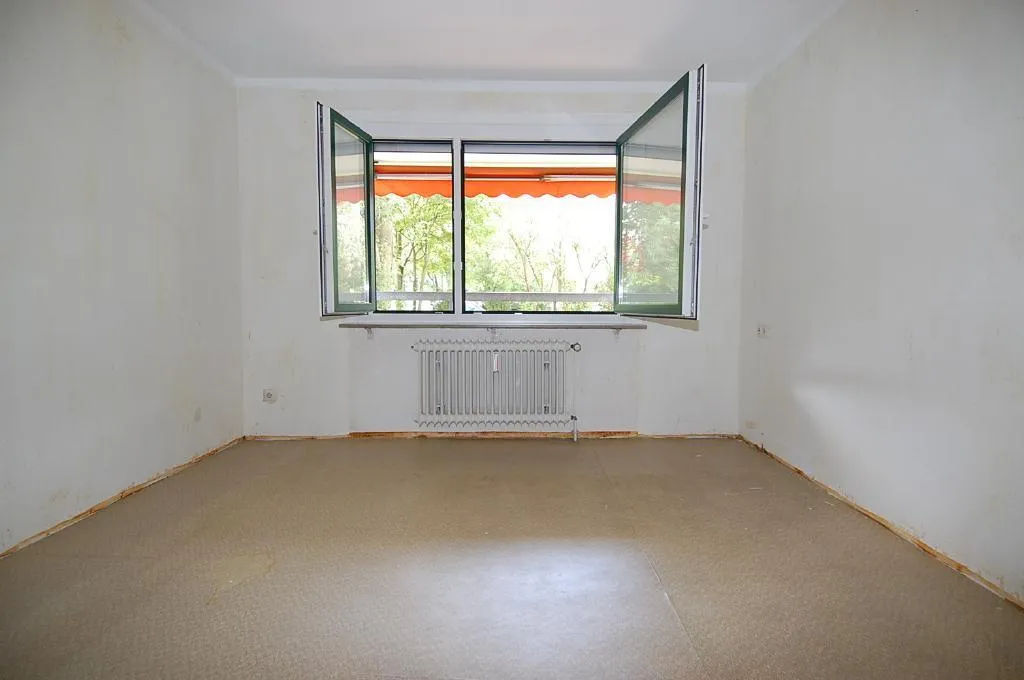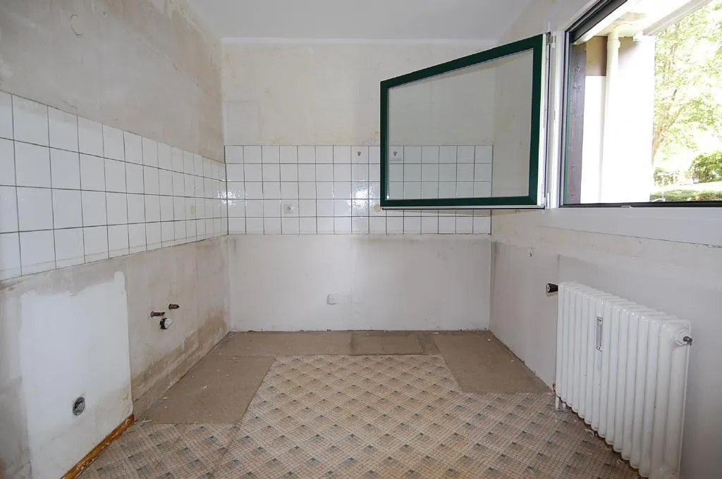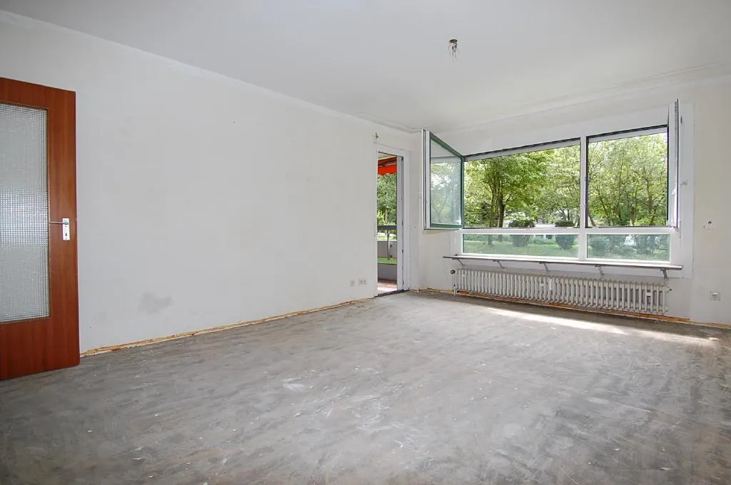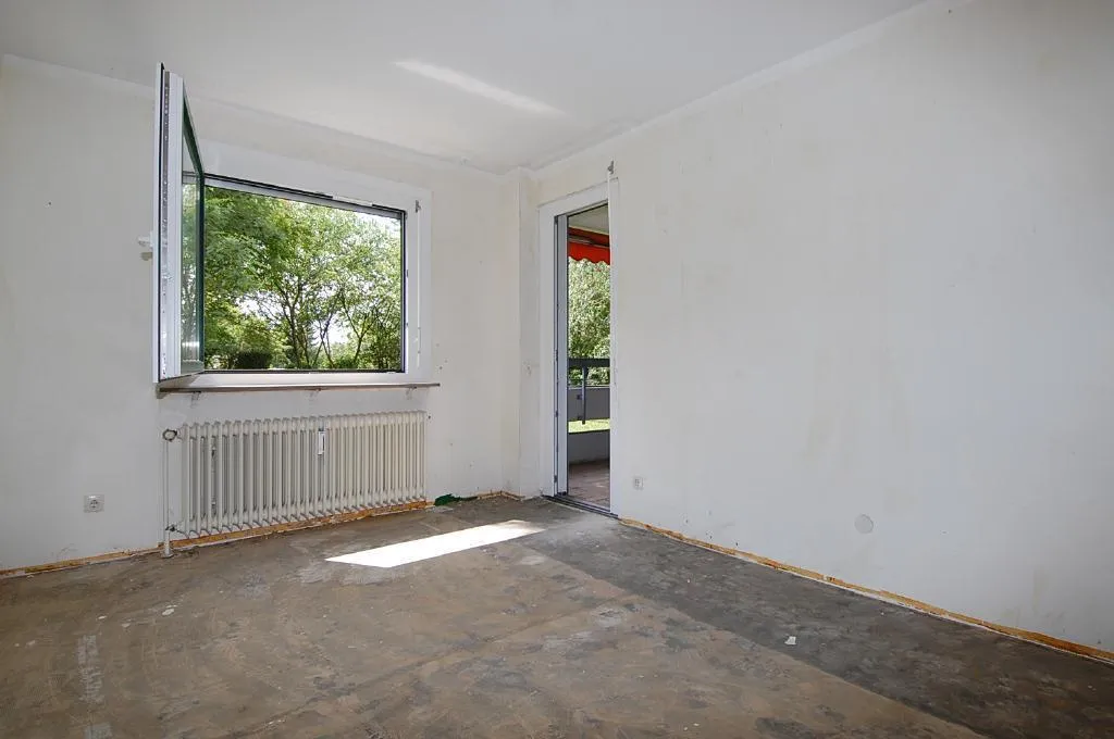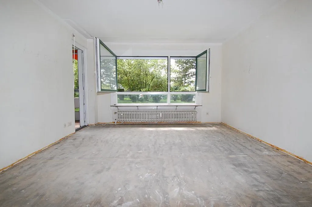 Diese renovierungsbedürftige und großzügige 3 1/2-Zimmer-Wohnung mit Blick ins Grüne befindet sich im Erdgeschoss eines Hochhauses mit 25 Wohneinheiten.