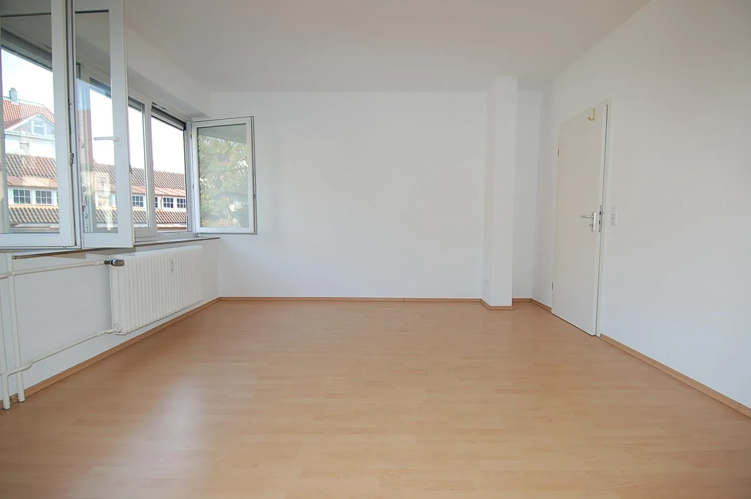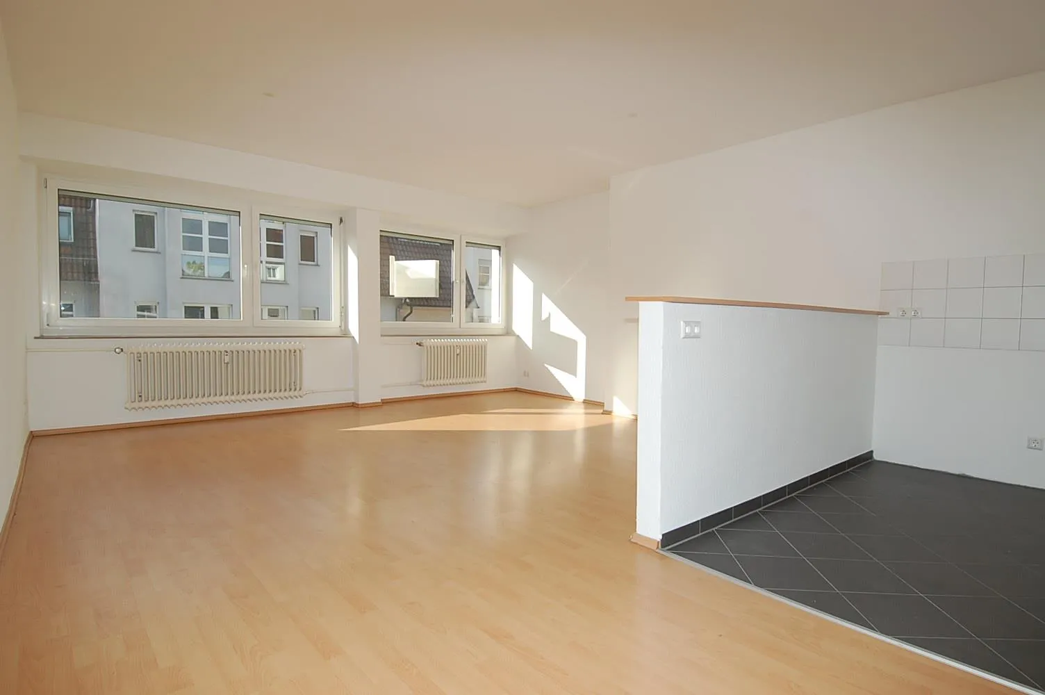 Der Wohn- und Essbereich ist mit Laminat ausgestattet und verfügt über eine offene Küche.