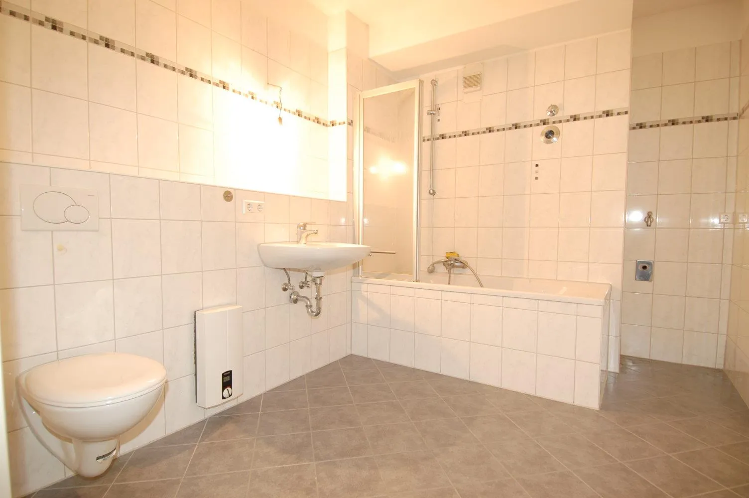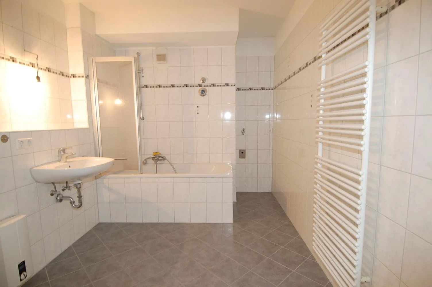 Das Badezimmer ist raumhoch gefliest, mit einer Wanne, Waschbecken, WC und Handtuchheizkörper ausgestattet. Zusätzlich gibt es im Badezimmer einen Waschmaschinenanschluss.