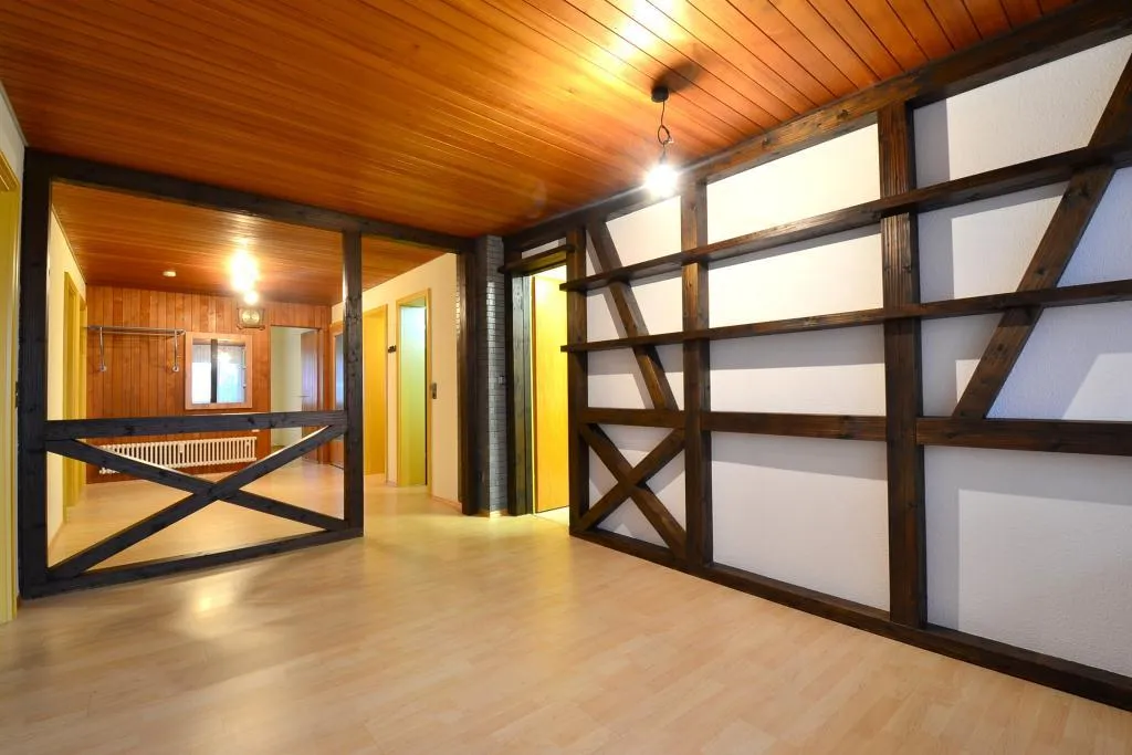 Auf den Fotos sind die Holzdecken braun. Diese werden noch vom Vermieter weiß lackiert.