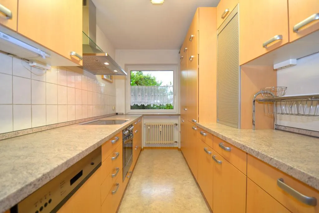 Die Küche ist mit einem Linoleum-Boden und mit einer Einbauküche ausgestattet. Die Einbauküche befindet sich in einem sehr gepflegten Zustand und ist ausgestattet mit Dunstabzugshaube, Herd mit Backofen, Kühlschrank und Gefrierschrank, Spülmaschine, Ober- und Unterschränken.