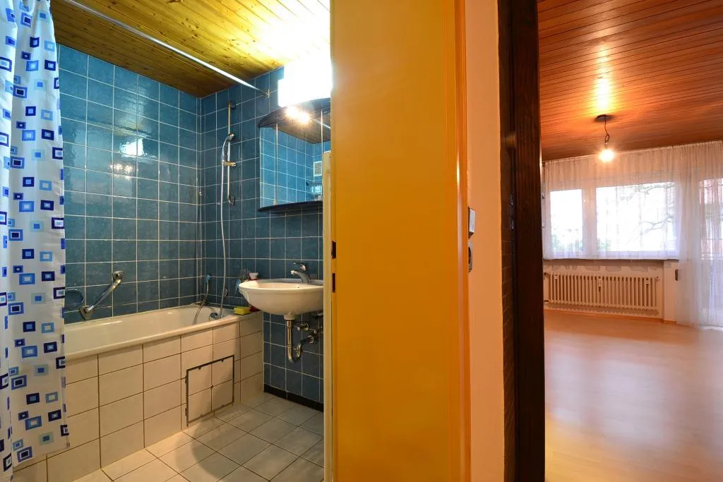 Das Badezimmer ist mit blauen Fliesen aus dem Ursprungsbaujahr raumhoch gefliest. Die Badewanne und die Armaturen wurden modernisiert. Der Boden ist gefliest.