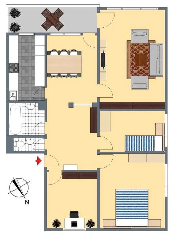 Der Grundriss der Wohnung ist gut. Von der großzügigen Diele und dem offenen Essbereich sind alle Räume begehbar. Das WC ist separat. Der Balkon ist vom Essbereich und vom Wohnzimmer begehbar.