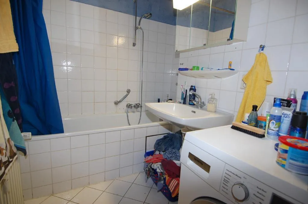 Das Badezimmer ist halbhoch gefliest und mit einer Wanne und einen Waschmaschinenanschluß ausgestattet.
