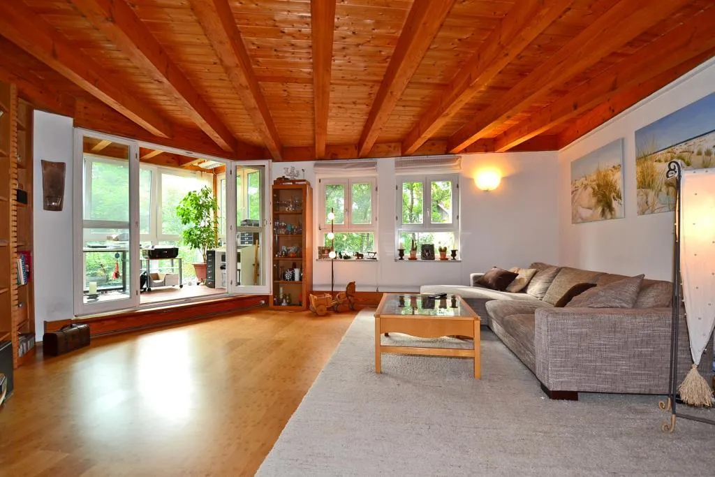 Die Wände sind überwiegend verputzt. Die Raumhöhe beträgt ca. 2,44 Meter. Die Decke im Wohnzimmer ist mit freigelegten Holzbalken verziert.