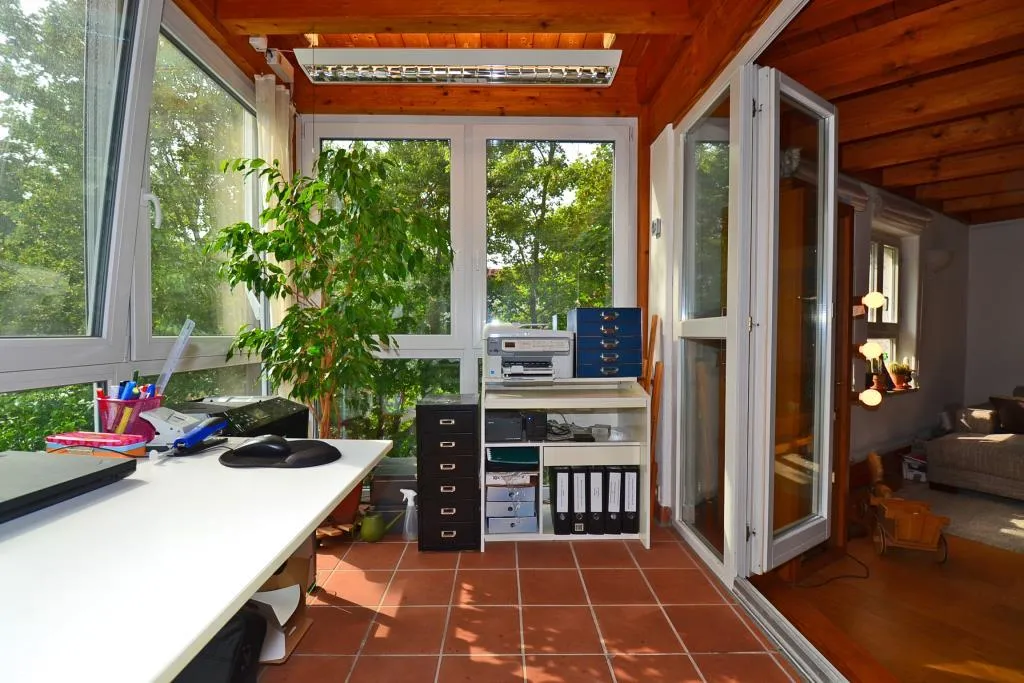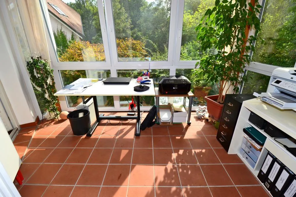 Über das Wohnzimmer sowie über die Küche ist der knapp 7 m² große Wintergarten begehbar. Der Wintergarten ist nach Süden ausgerichtet.