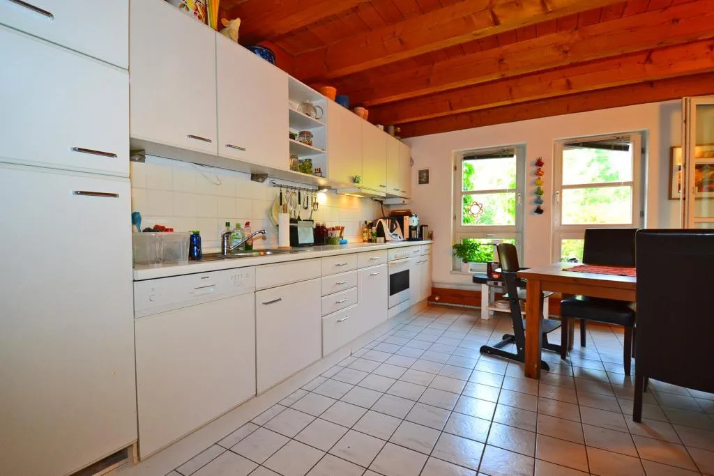 Die Küche ist mit einem Außenabzug sowie mit einer älteren Einbauküche ohne Kühl-/Gefrierschrank ausgestattet. Die Einbauküche wird zur kostenlosen Nutzung überlassen. Bei Bedarf kann die Einbauküche auf eigene Kosten ausgewechselt werden.