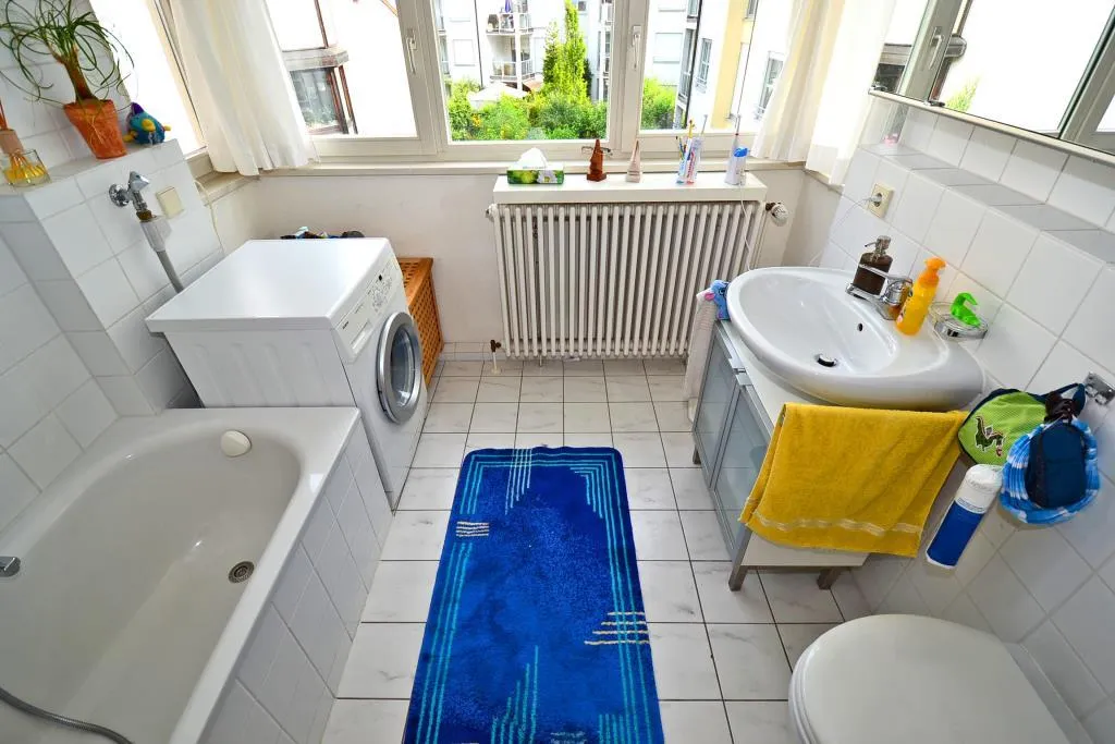 Ein halbhoch gefliestes Badezimmer mit Fenster ist ausgestattet mit einer Badewanne, einem Waschmaschinenanschluss sowie einem WC. Das zweite, innenliegende Badezimmer ist halbhoch gefliest und ausgestattet mit einer Dusche und einem WC.