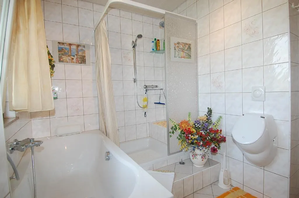 Das Badezimmer ist raumhoch gefliest. Es verfügt über ein Fenster und ist ausgestattet mit einer Badewanne, einer Dusche, einem Urinal, einem Handtuchheizkörper und einem Badezimmerschrank mit Waschbecken.