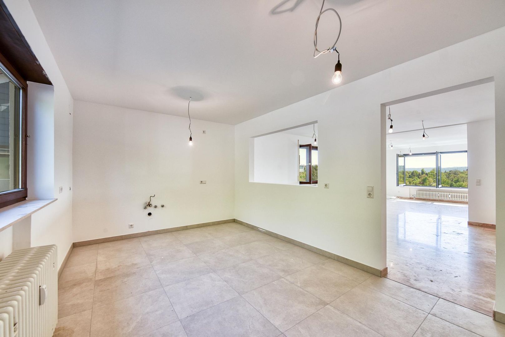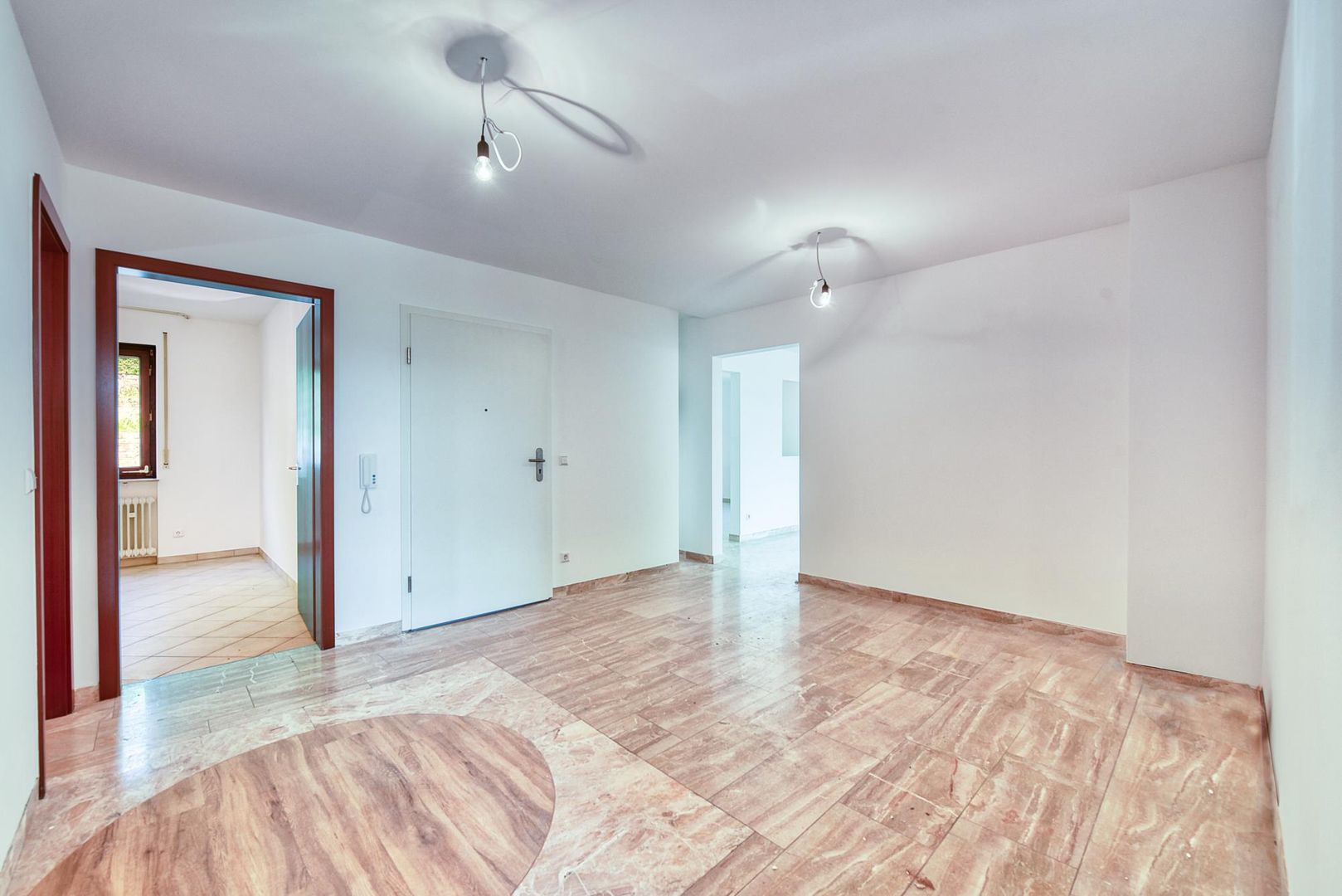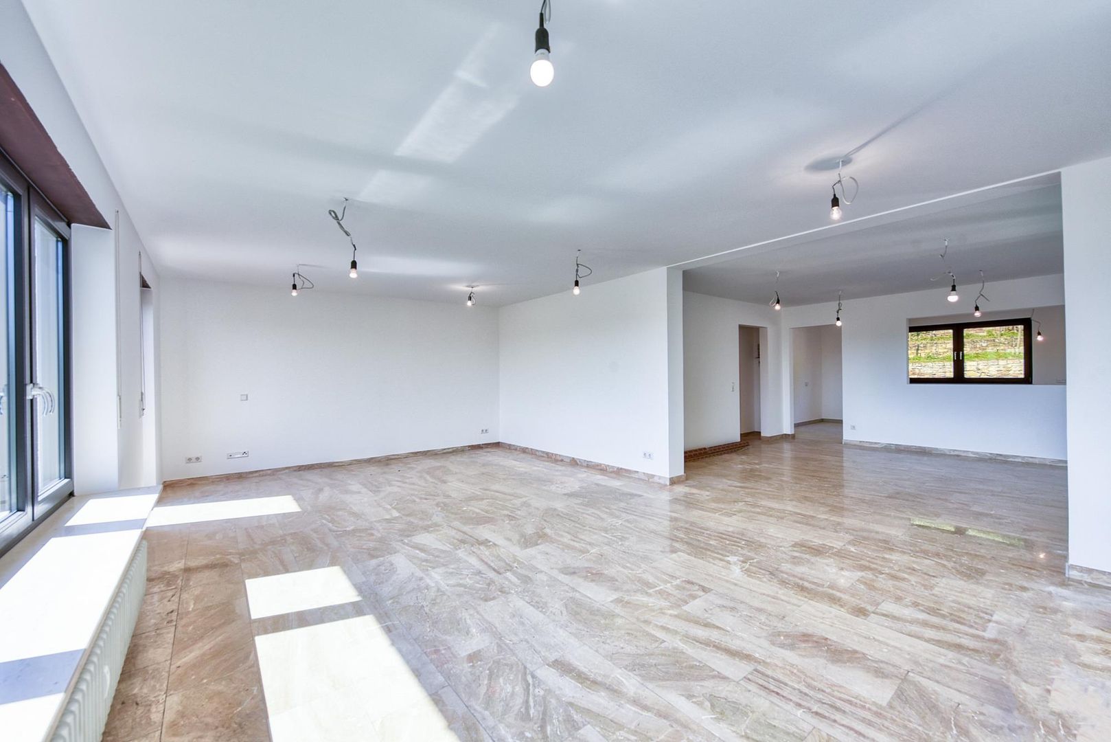 Die Böden in der Diele sowie im Wohn-/Essbereich sind mit Marmorstein ausgestattet. Der Boden im Arbeitszimmer ist gefliest.