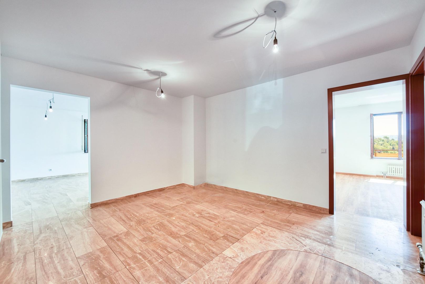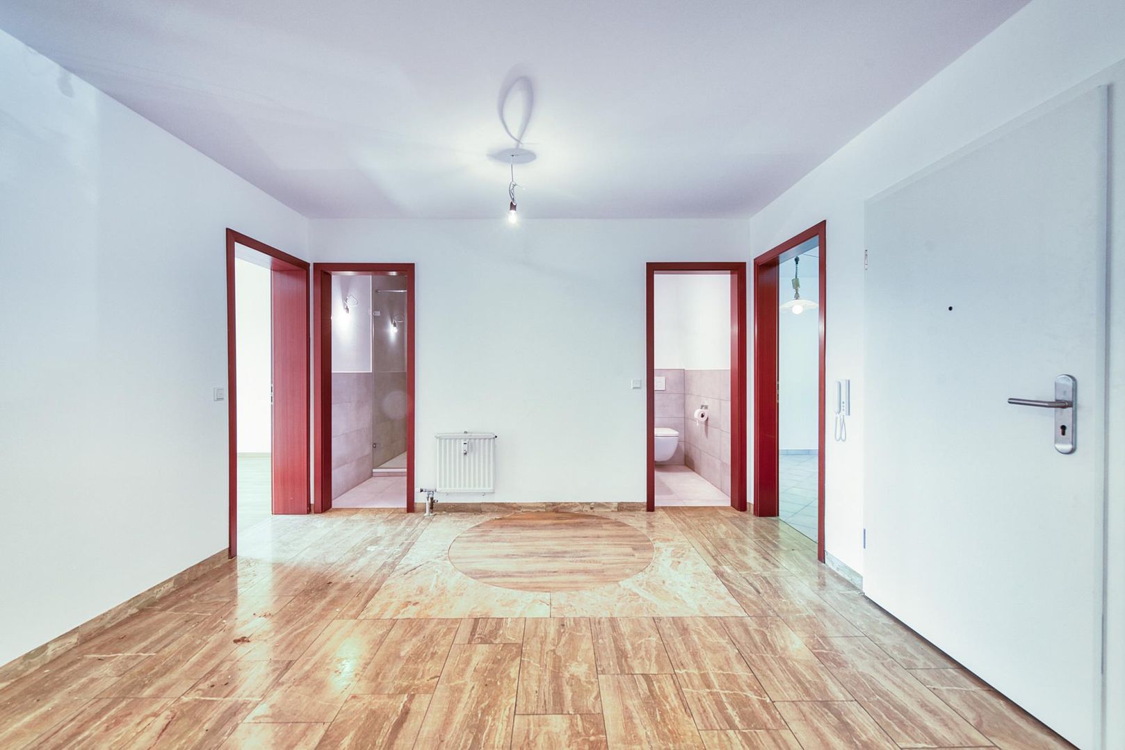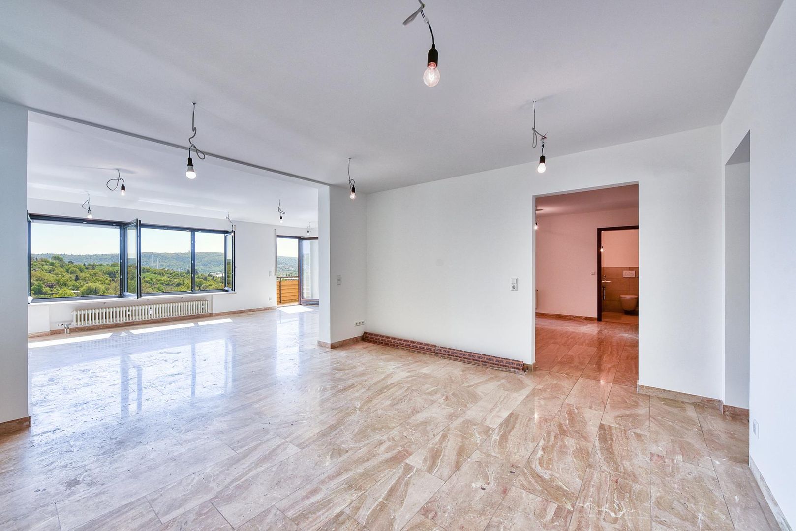 Die Böden in der Diele sowie im Wohn-/Essbereich sind mit Marmorstein ausgestattet. Der Boden im Arbeitszimmer ist gefliest.