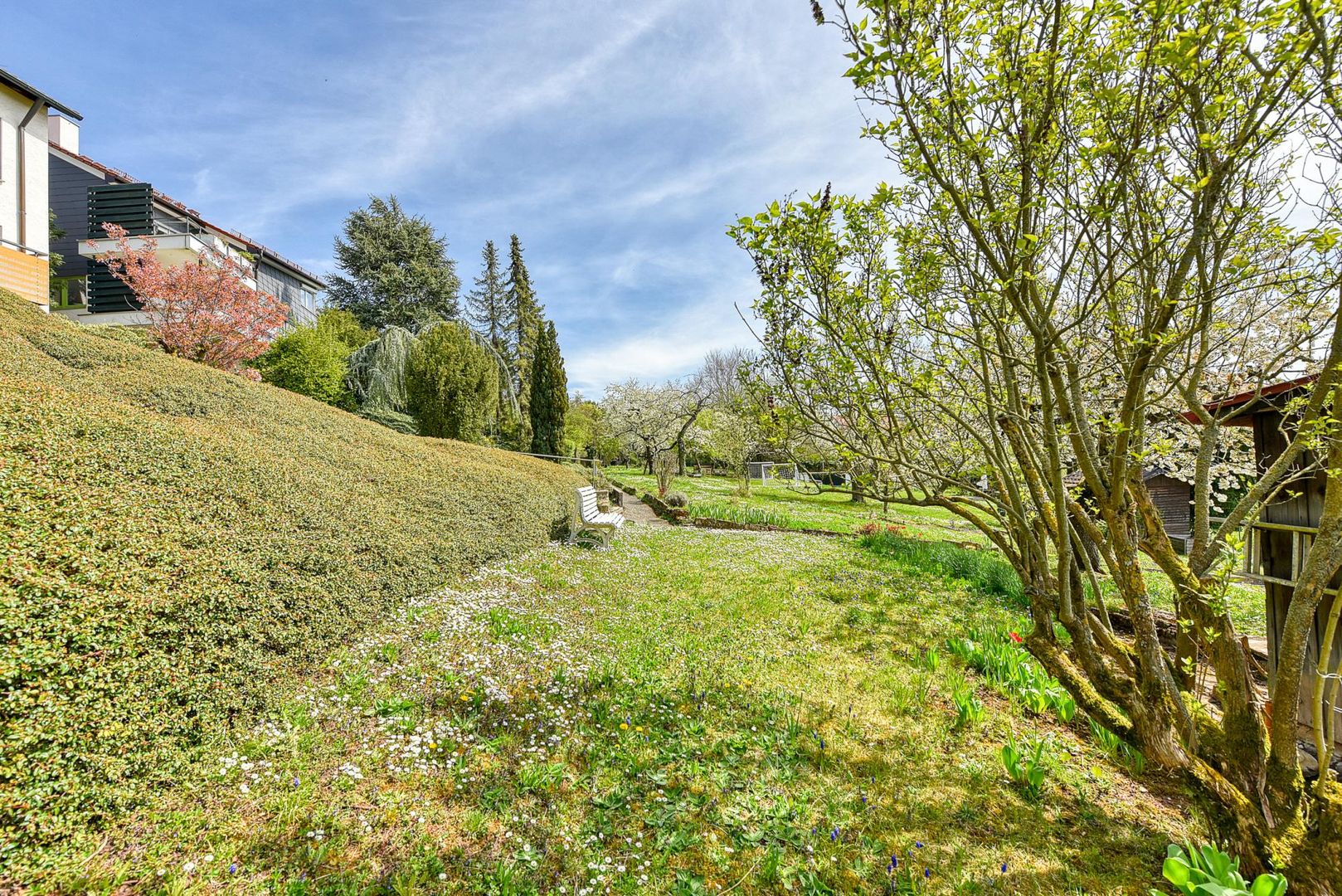 In der Nähe befinden sich grüne Spazierwege an Schrebergärten, Wiesen und Feldern.