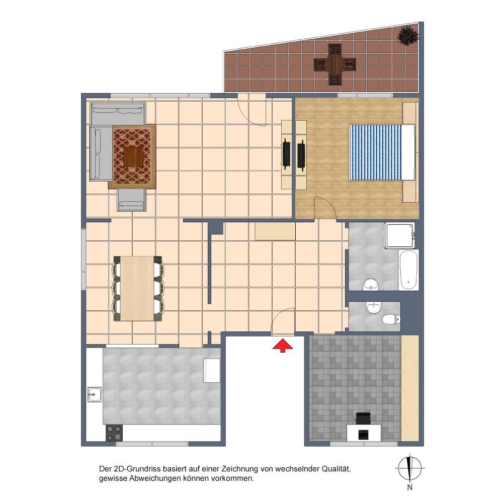 Der Grundriss ist sehr gut: alle Räume sind direkt vom Flur begehbar. Die Küche ist zum Ess-/Wohnbereich offen. Der 13 m² große Süd-Balkon mit Markise ist über das Wohnzimmer begehbar. Das Badezimmer ist innenliegend. Das innenliegende WC ist separat.