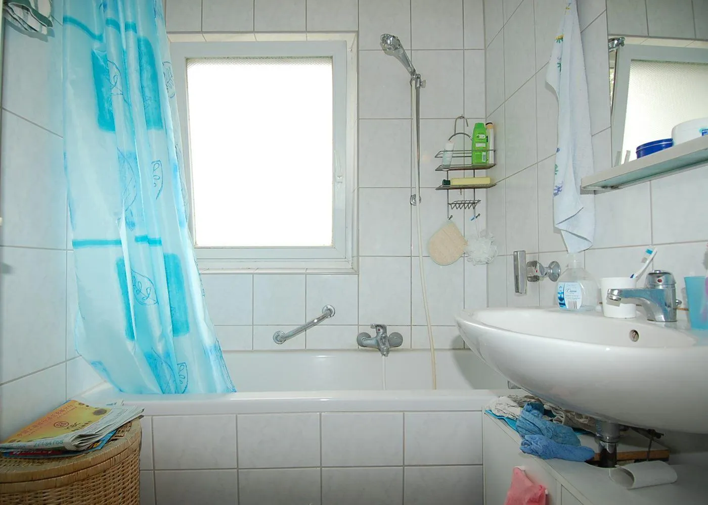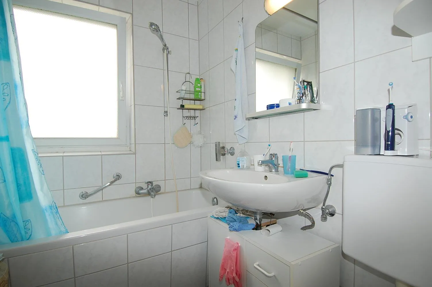 Das raumhoch geflieste Tageslicht-Bad ist ausgestattet mit einer Badewanne sowie einem WC.