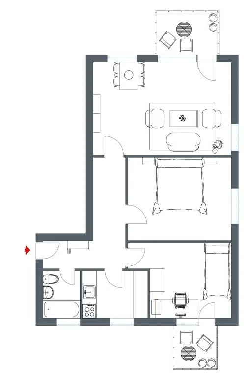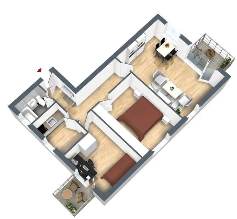 Der Grundriss ist sehr gut. Alle Räume sind direkt vom Flur begehbar. Das Badezimmer verfügt über ein Fenster. Der überdachte Süd-Balkon ist über das Wohnzimmer begehbar. Der Nord-Balkon ist über das Arbeitszimmer begehbar.