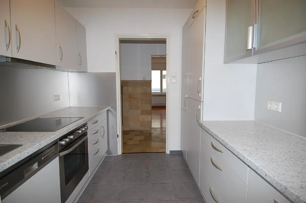 Die Küche ist mit einer neuwertigen EBK und Fliesenboden ausgestattet. Zur EBK gehören ein Kühlschrank, ein Kochfeld, ein Backofen und eine Spülmaschine.