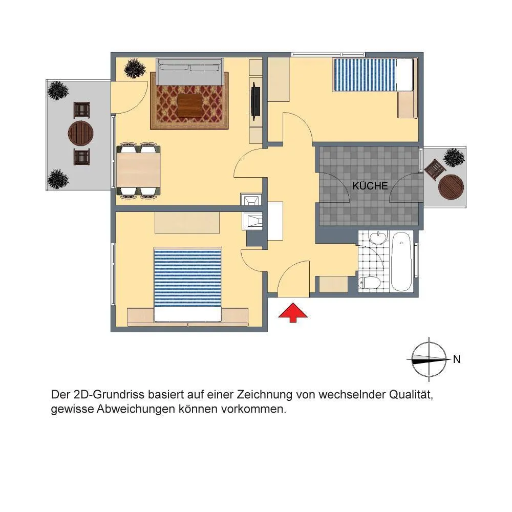 Der Grundriss der Wohnung ist sehr gut. Alle Räume sind vom Flur aus erreichbar. Die Wohnung verfügt über 2 Balkone (einen großen Süd-Balkon und einen kleinen Küchenbalkon) und ein Badezimmer mit Fenster.
