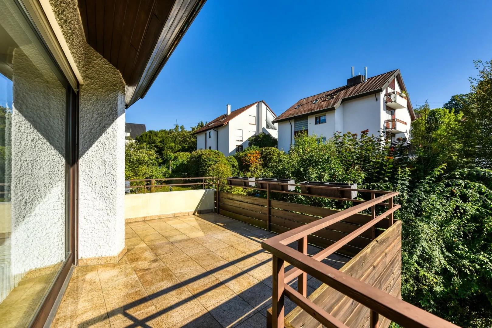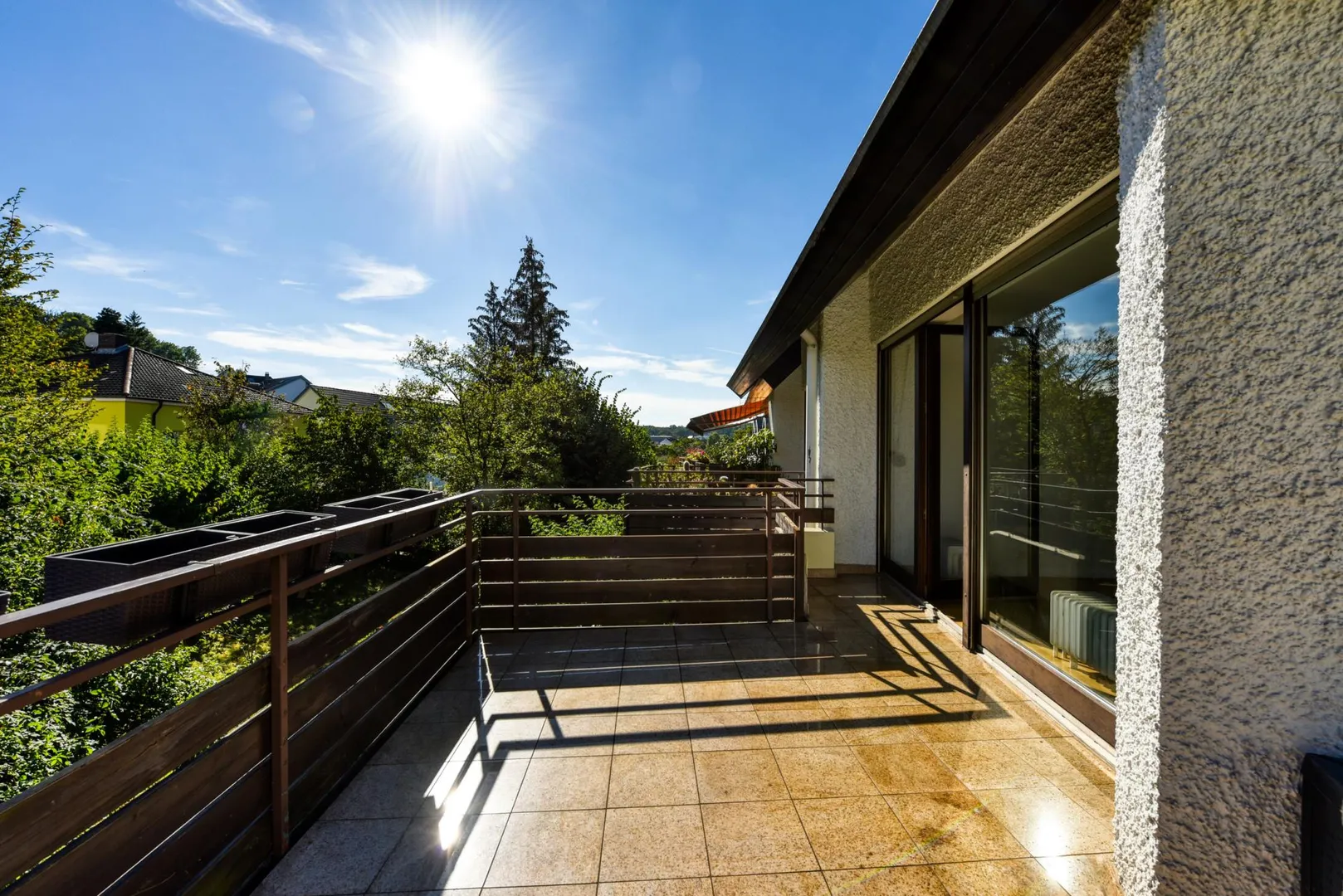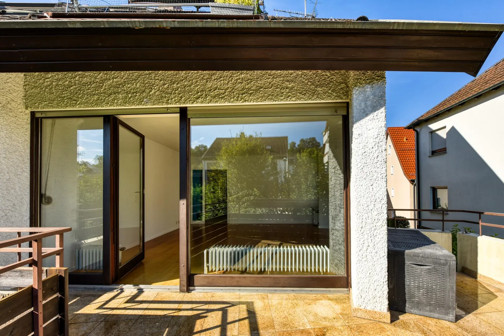 Das Haus wurde 1980, freistehend, auf einem 771 m² großen Grundstück in Nord-Handlage, massiv, 2-geschossig, komplett unterkellert, mit Satteldach und Tiefgarage erstellt. Von der Straße gibt es einige Stufen abwärts zum Haus. Von der Tiefgarage ausgesehen, welche sich im Untergeschoss befindet, befindet sich die Wohnung im 2. Obergeschoss. Im Haus gibt es keinen Aufzug.