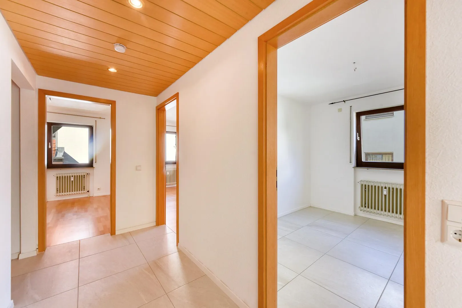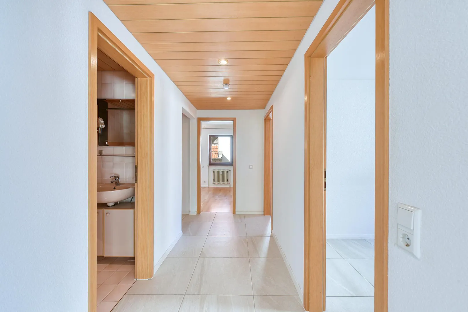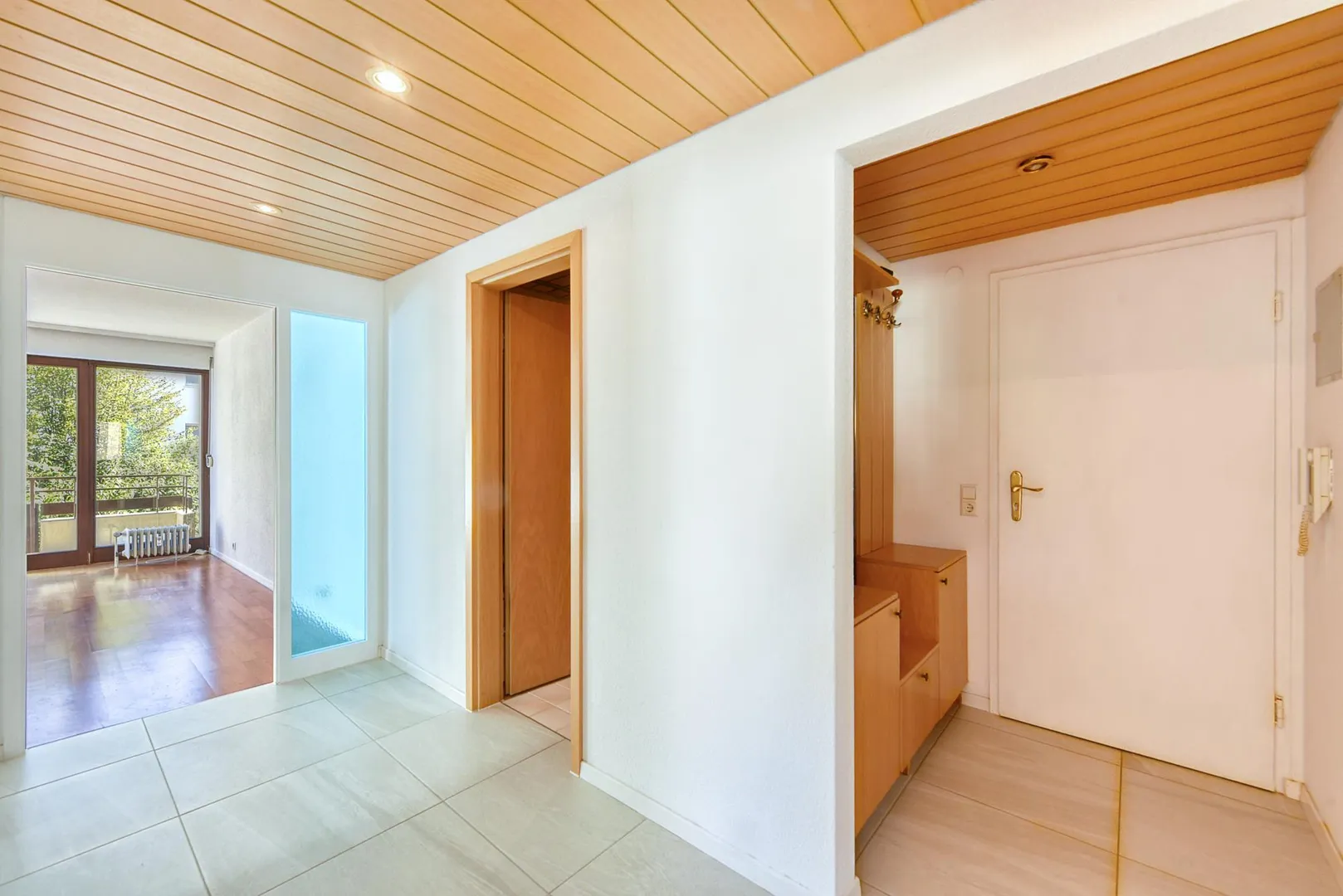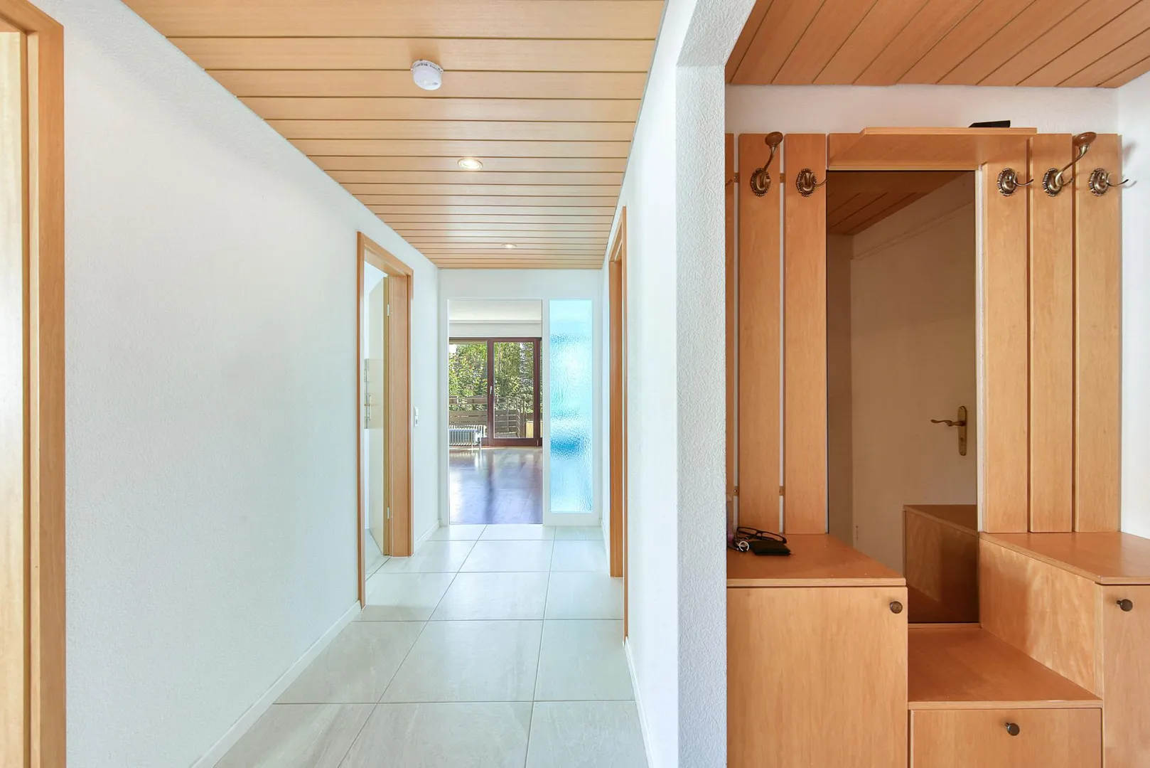 Der Flur ist mit einer Garderobe sowie mit Holzdecken ausgestattet.