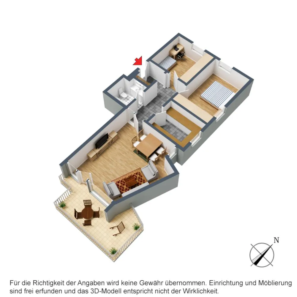 Das Wohnzimmer ist nach Osten und Süden ausgerichtet. Der Balkon ist nach Süden ausgerichtet. Die Küche ist nach Osten ausgerichtet. Das Schlafzimmer ist nach Norden und Osten ausgerichtet. Das Kinderzimmer ist nach Norden ausgerichtet.