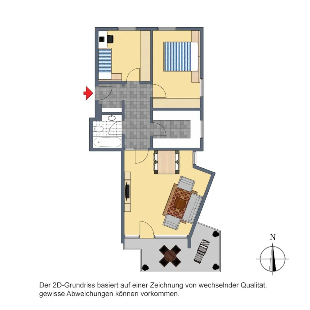 Der Grundriss ist gut: alle Räume sind direkt vom Flur begehbar. Der ca. 12,5 m² große Süd-Balkon ist über das Wohnzimmer begehbar. Das Badezimmer mit WC ist innenliegend.