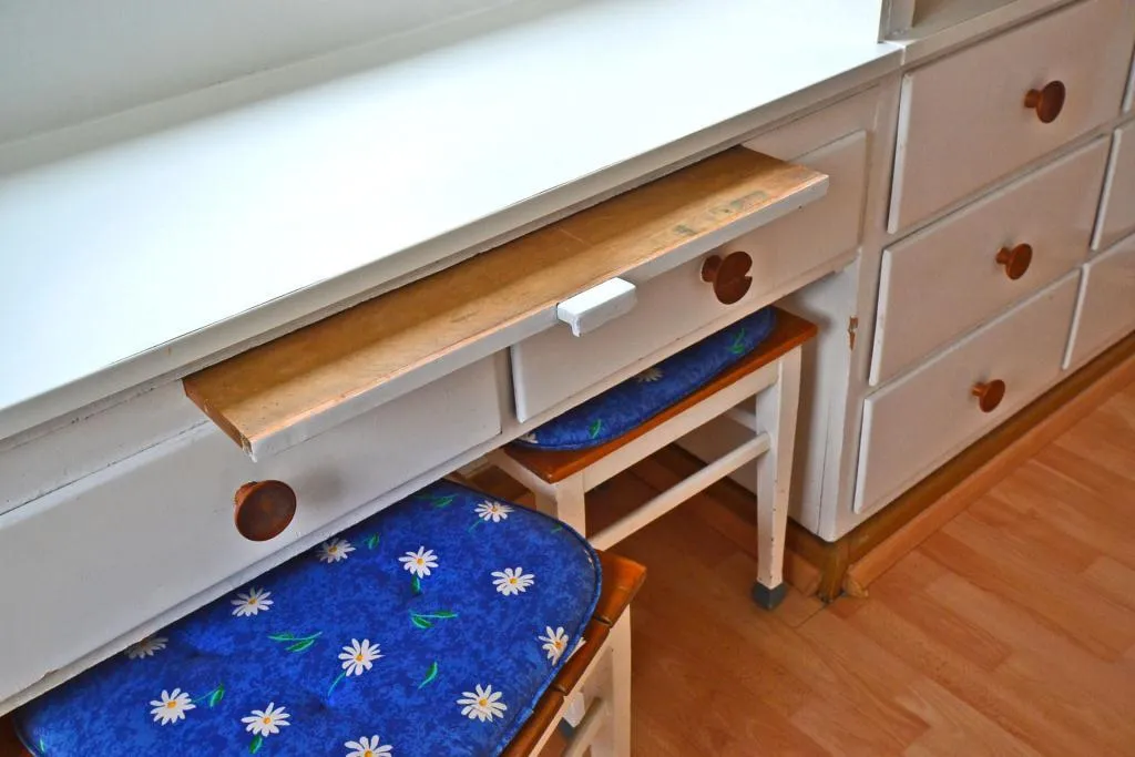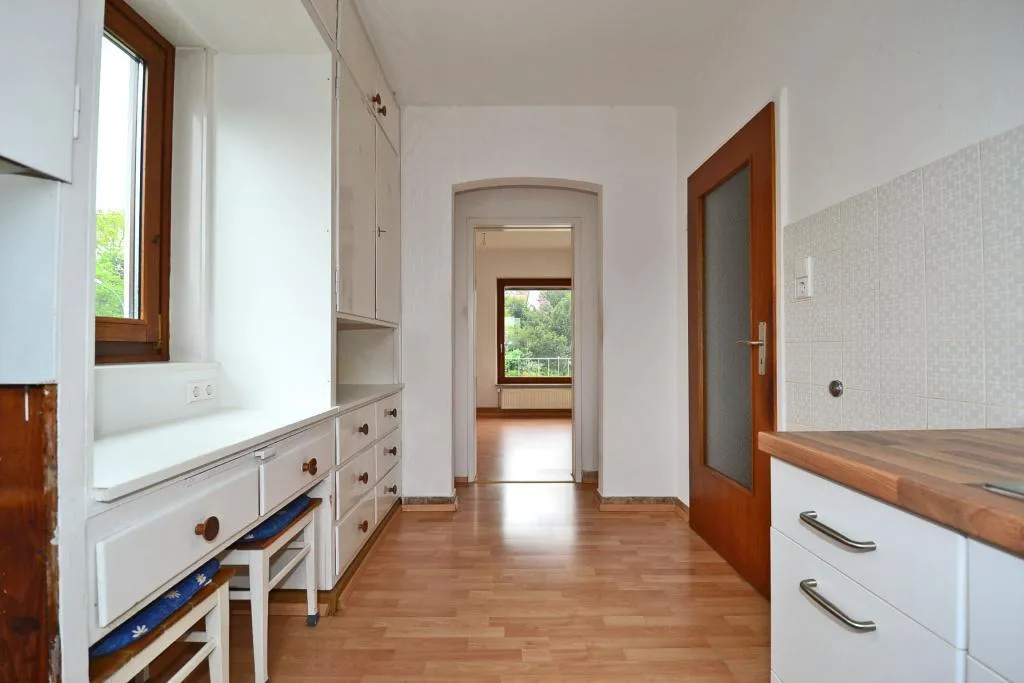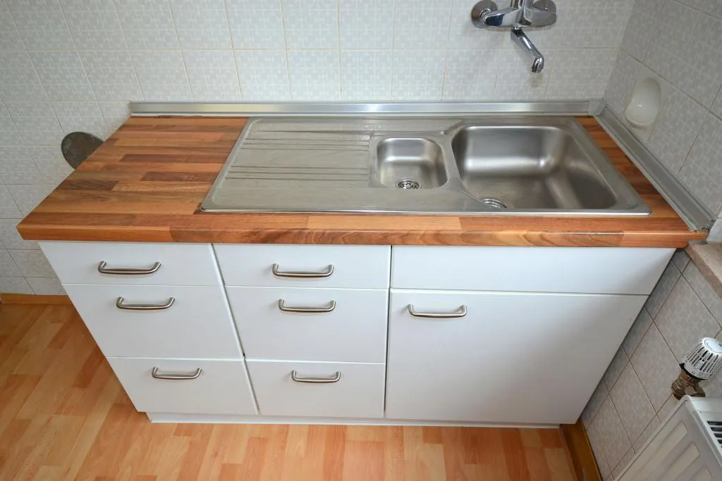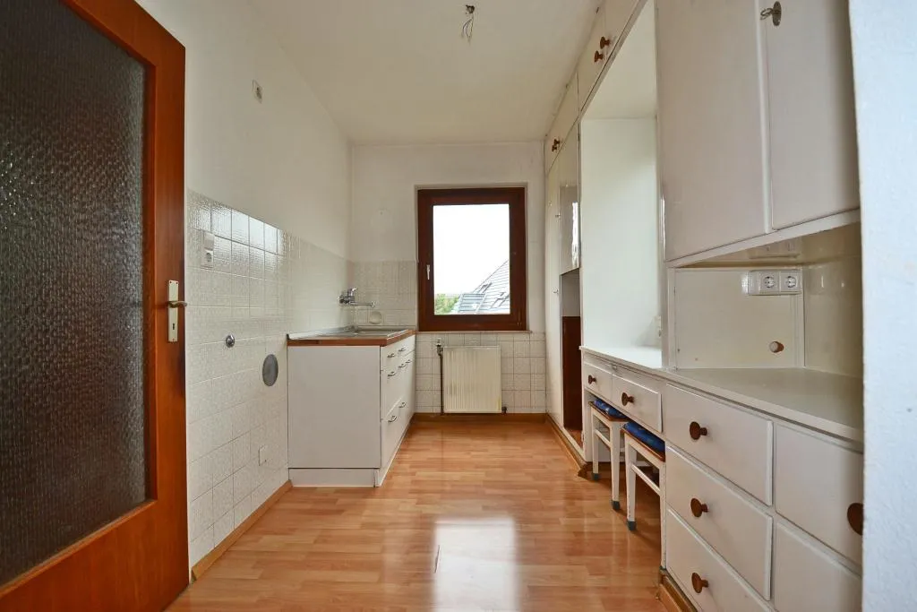 Die Küche ist mit eingebauten Küchenmöbel aus dem Ursprungsbaujahr und einer neuen Küchenzeile mit Spüle ausgestattet. Es sind keine Elektro-Geräte vorhanden.