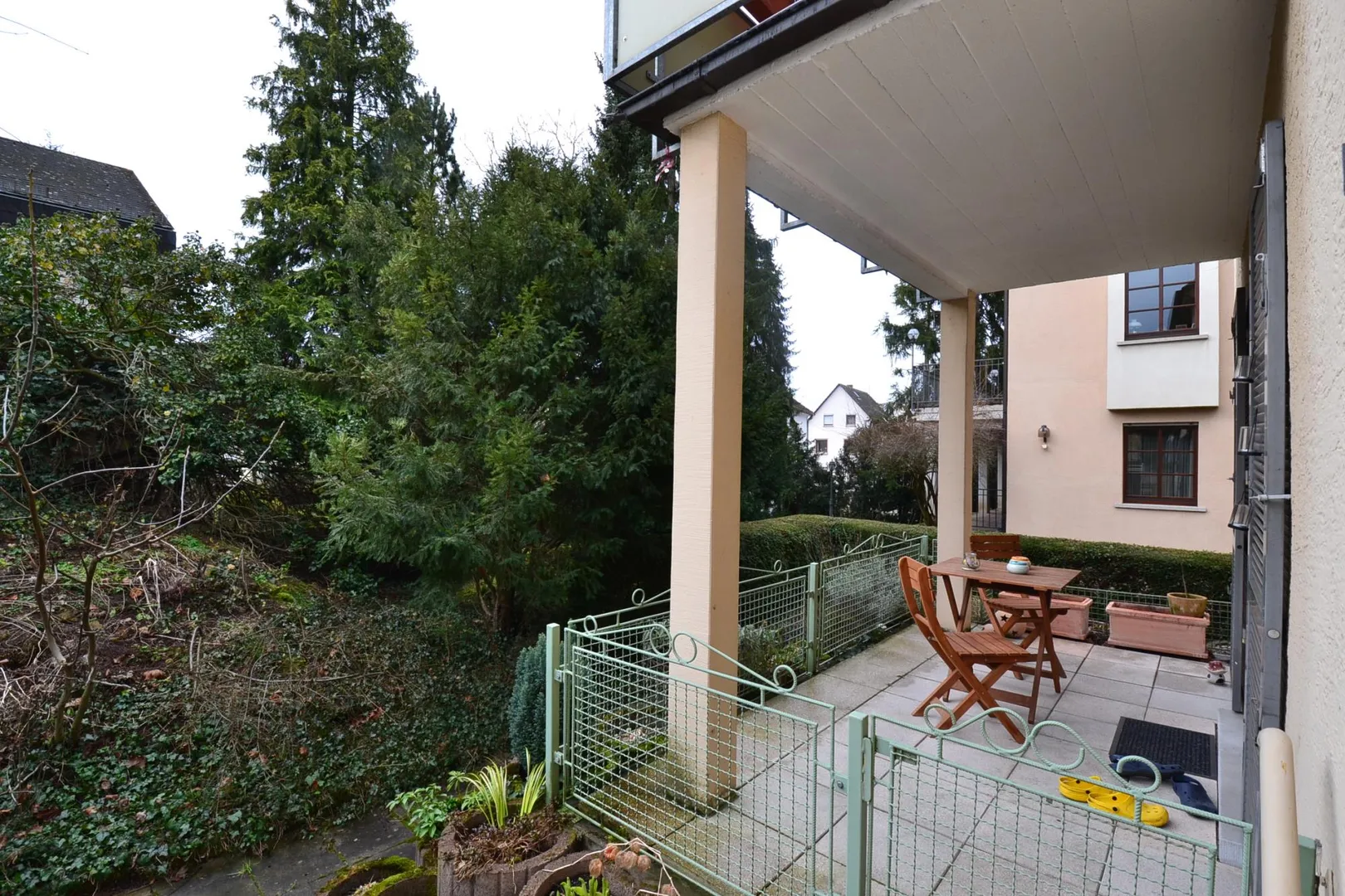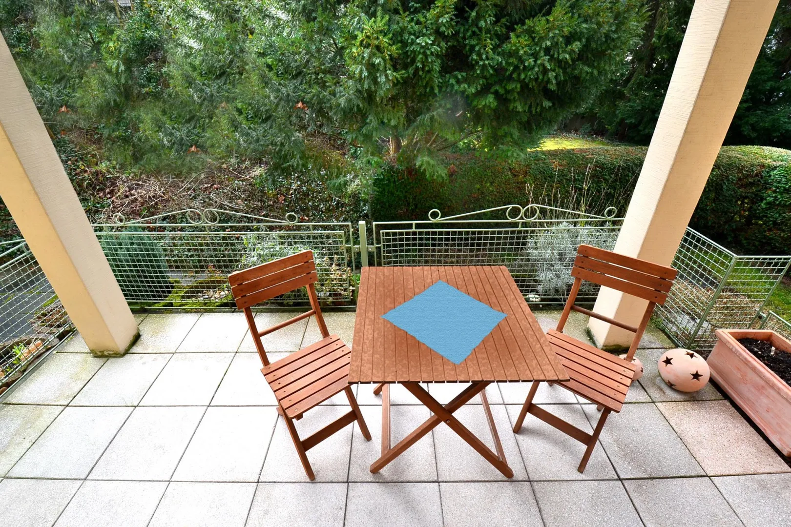 Die Terrasse ist ca. 8,5 m² groß und ist komplett überdacht. Die Terrasse ist vom Grün umgeben.
