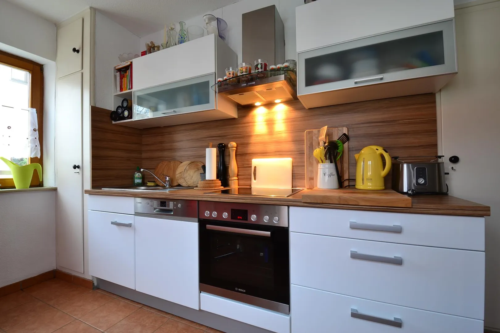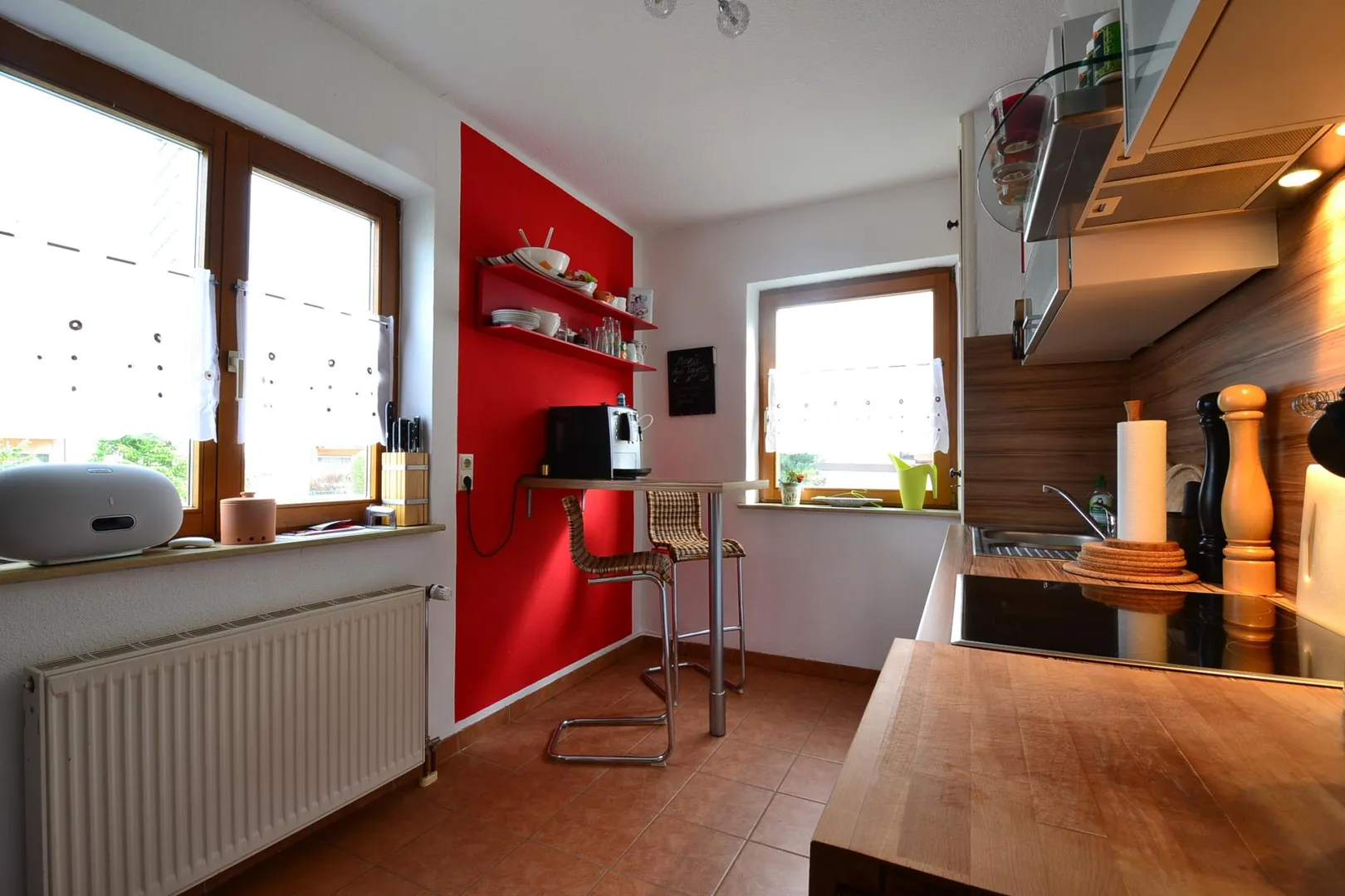 Die Küche ist mit einer hochwertigen Einbauküche mit einem Tisch und zwei Stühlen ausgestattet. Die Einbauküche verfügt über einen Kühlschrank mit Gefrierschrank, eine Spülmaschine, einen Herd mit Backofen, eine Dunstabzugshaube, Ober- und Unterschränke. Es sind überwiegend Markengeräte von Bosch. Die Einbauküche wurde ca. 2009 für ca. 5.500 EUR angeschafft. Die Einbauküche kann für 3.500 EUR von den aktuellen Mietern übernommen werden.