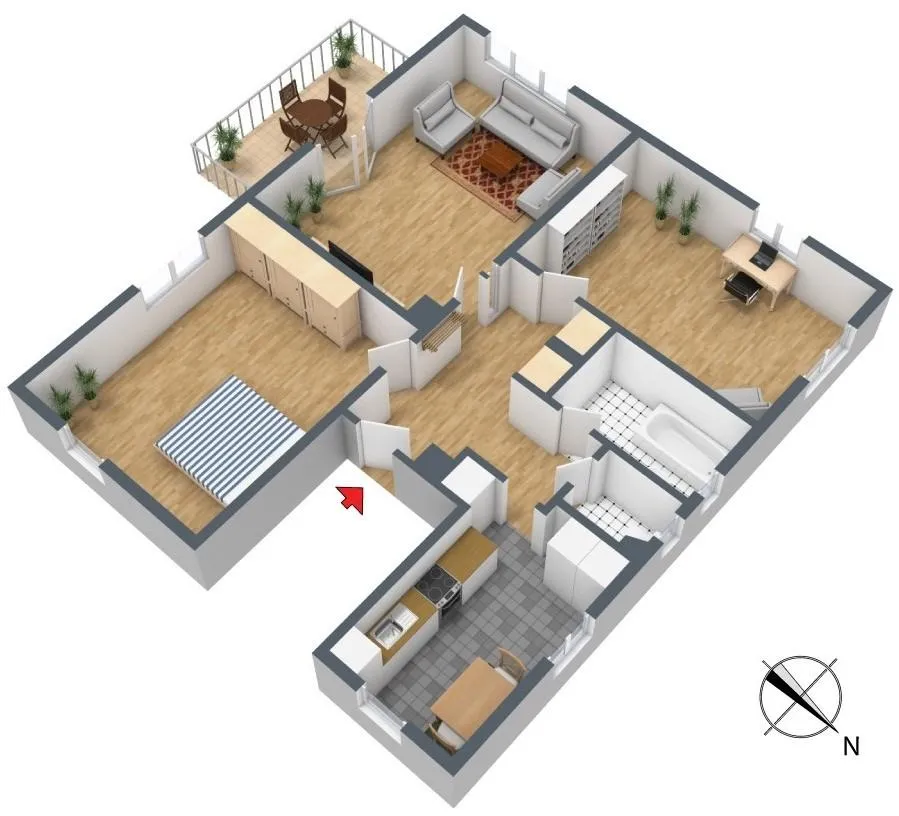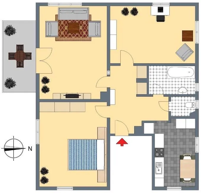 Der Grundriss ist sehr gut. Alle Räume sind vom Flur begehbar. Die Terrasse ist über das Wohnzimmer begehbar. Das Badezimmer verfügt über ein Fenster. Das geflieste WC mit Fenster ist separat.