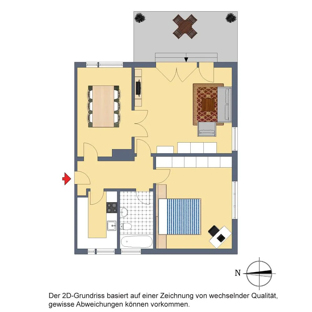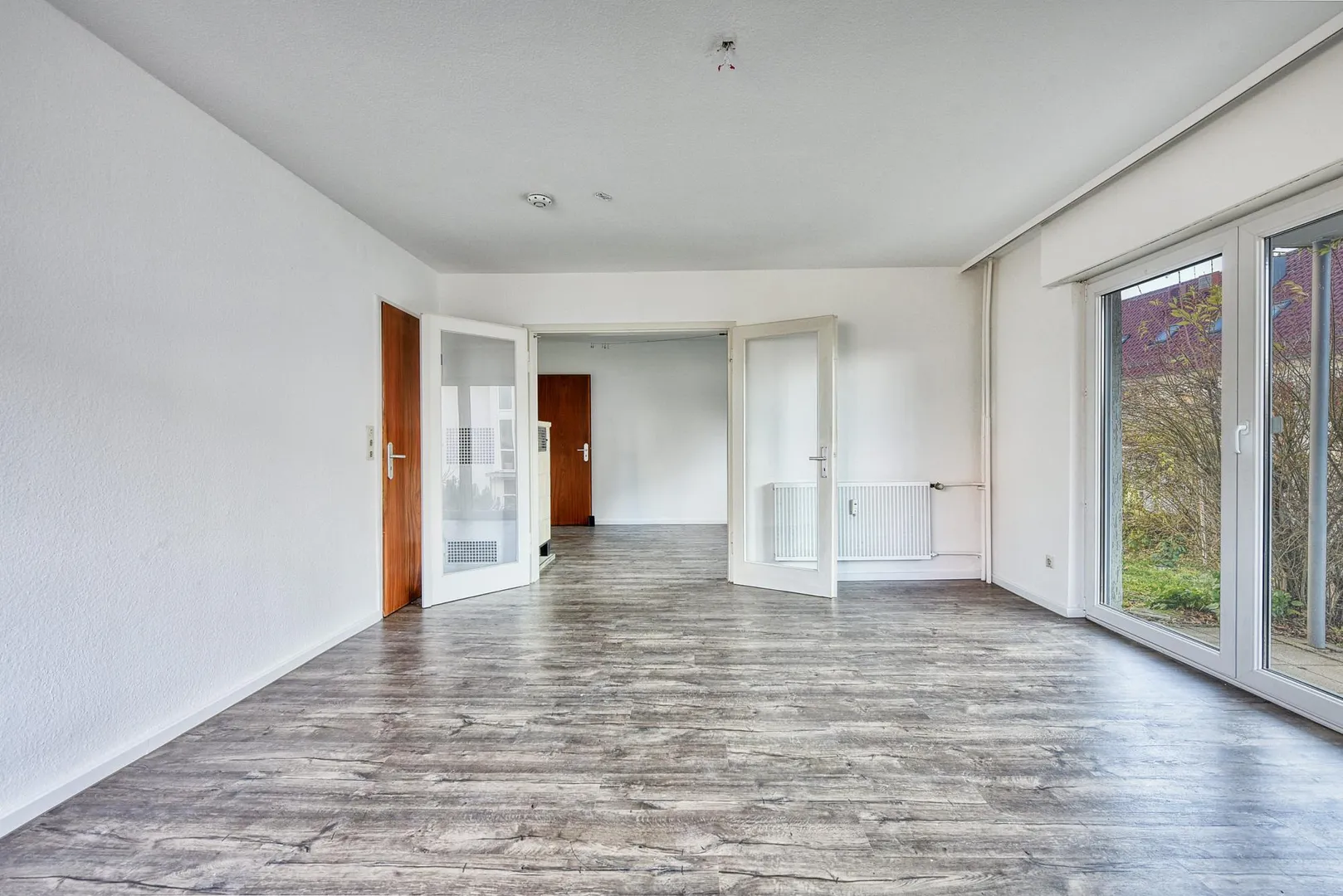 Der Grundriss ist gut: alle Räume sind direkt vom Flur begehbar. Die ca. 12 m² große und überdachte Ost-Terrasse sowie der Ost-Garten sind über das Wohnzimmer begehbar. Das Badezimmer verfügt über ein Fenster. Zwischen Wohn- und Esszimmer gibt es eine zweiflüglige Glas-Tür.