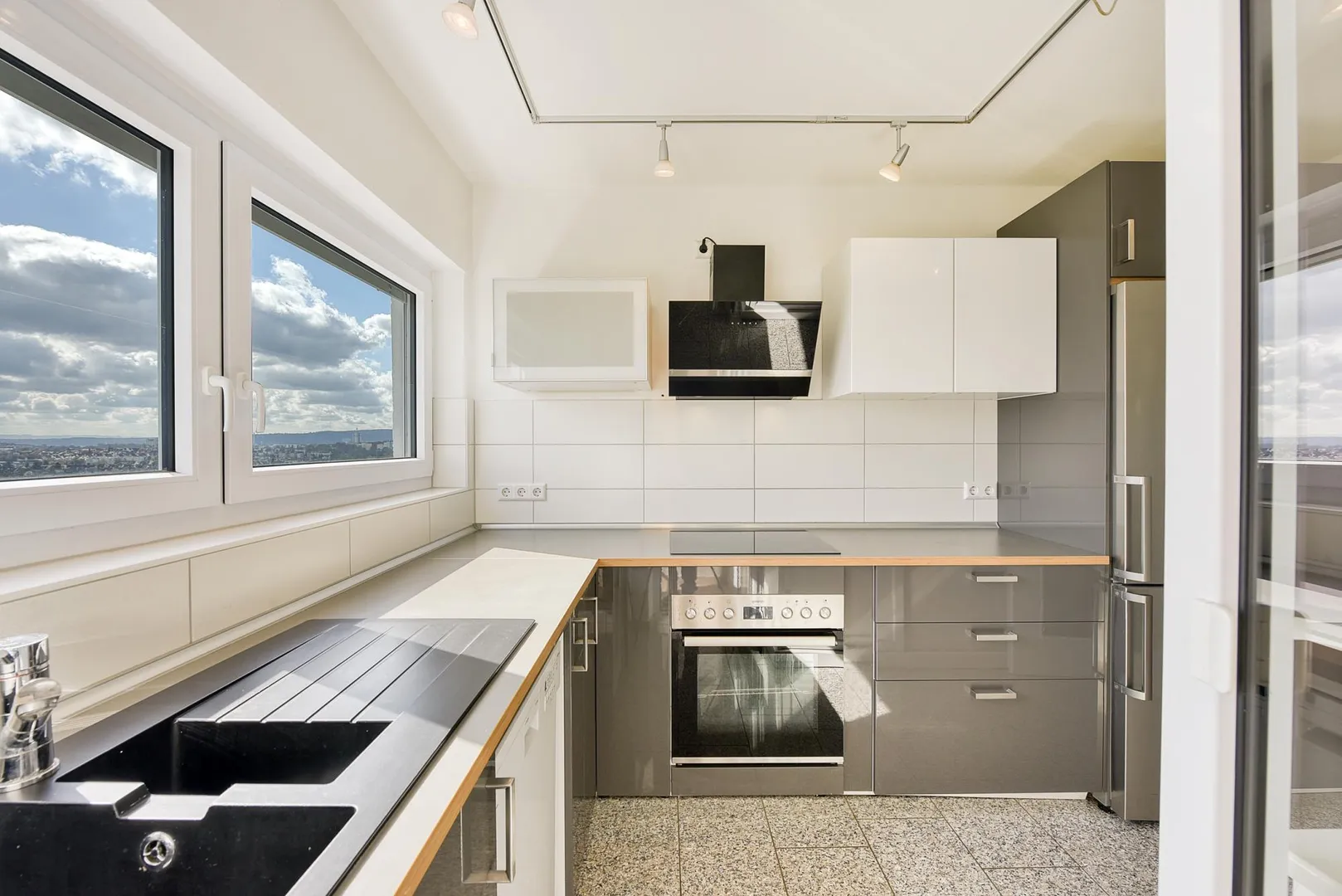 Die Einbauküche von 2014 verfügt über einen Herd mit Backofen, einen Kühlschrank, einen Gefrierschrank, eine Spülmaschine sowie Unter- und Oberschränke. Die E-Geräte sind funktionsfähig. Für die künftige Funktionsfähigkeit der E-Geräte übernimmt der Vermieter keine Haftung.