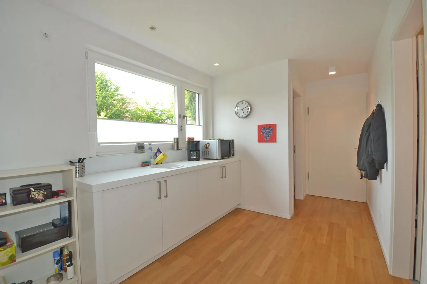 Die Wände sind weiß verputzt. In den Decken sind Einbauleuchten integriert.