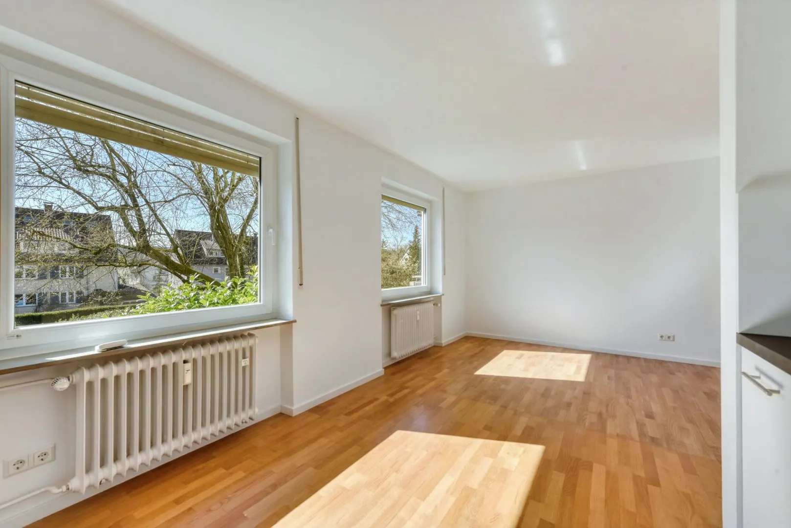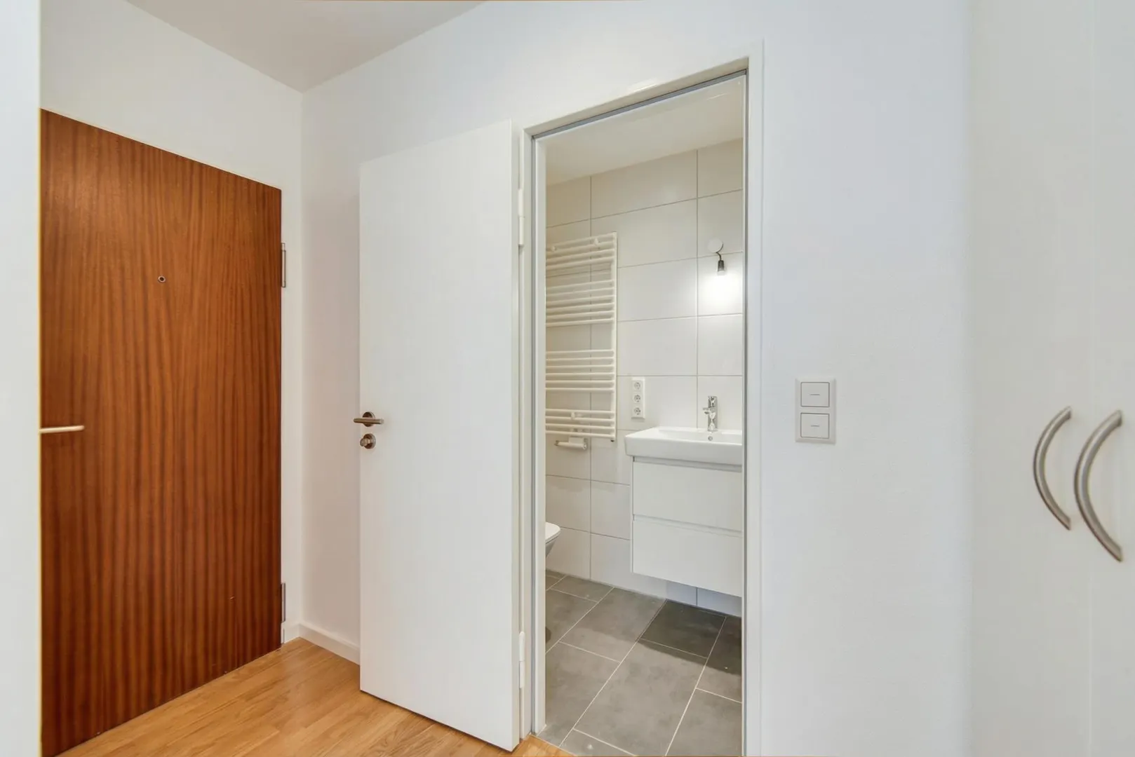 Im Windfang sowie im Zimmer ist Parkett verlegt. Der Boden im neuen Bad ist gefliest.