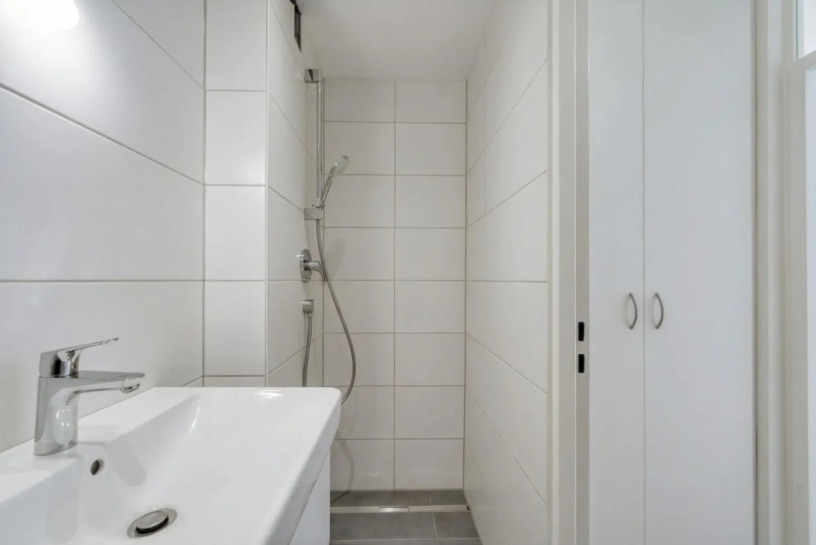 Das raumhoch geflieste Badezimmer ist ausgestattet mit einer bodenebenen Dusche, einem WC, einem Handtuch-Heizkörper sowie einem Waschtisch mit einem Unterschrank.
