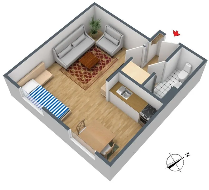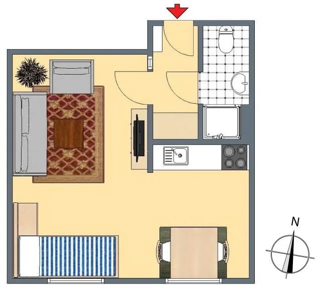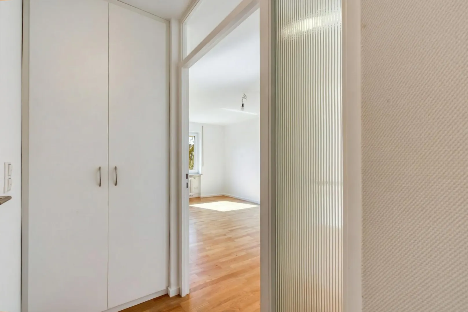 Im Windfang/Flur befindet sich ein Einbauschrank. Über den Windfang geht es links ins neue kleine Bad mit Dusche und WC. Rechts geht´s ins Zimmer mit offener Küche.