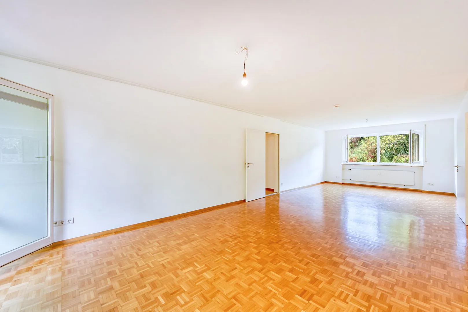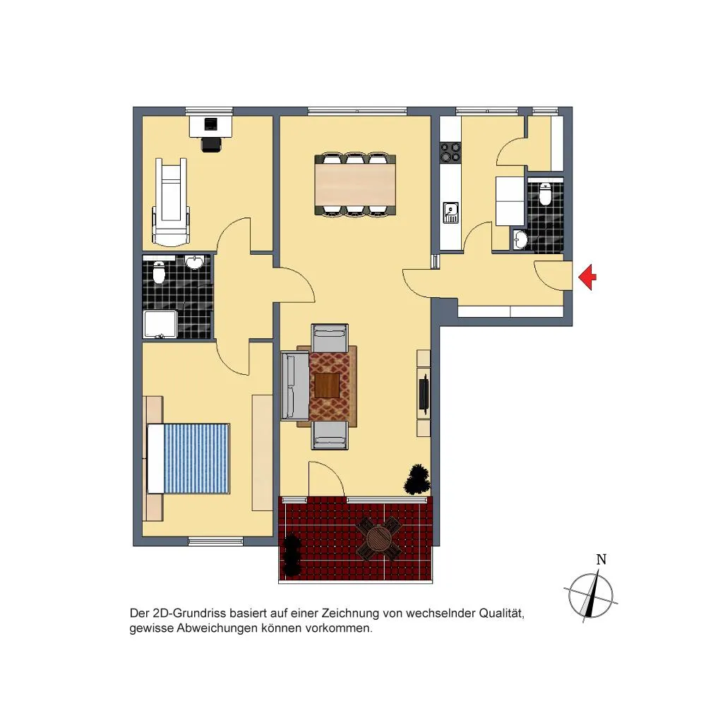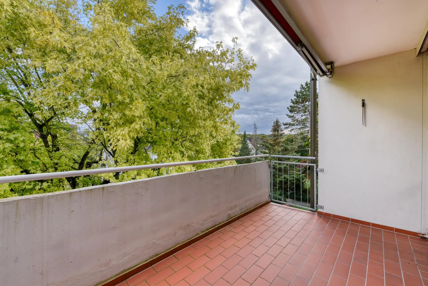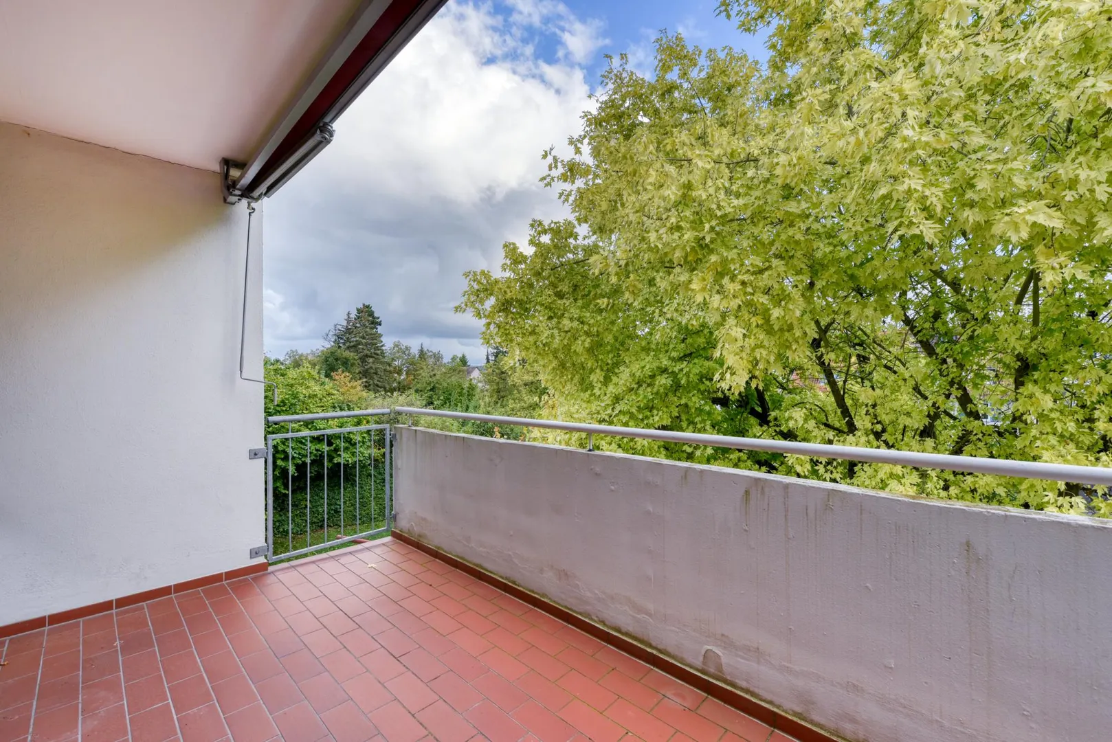 Der Grundriss ist offen gestaltet: über den großzügigen Wohn-/Essbereich geht es zum Bad und zu den Zimmern. Der ca. 8 m² große und teilüberdachte Süd-Balkon verfügt über eine Markise und ist über den Wohnbereich begehbar. In der Wohnung gibt es eine Speisekammer hinter der Küche sowie ein Gäste-WC (zweites, separates WC).