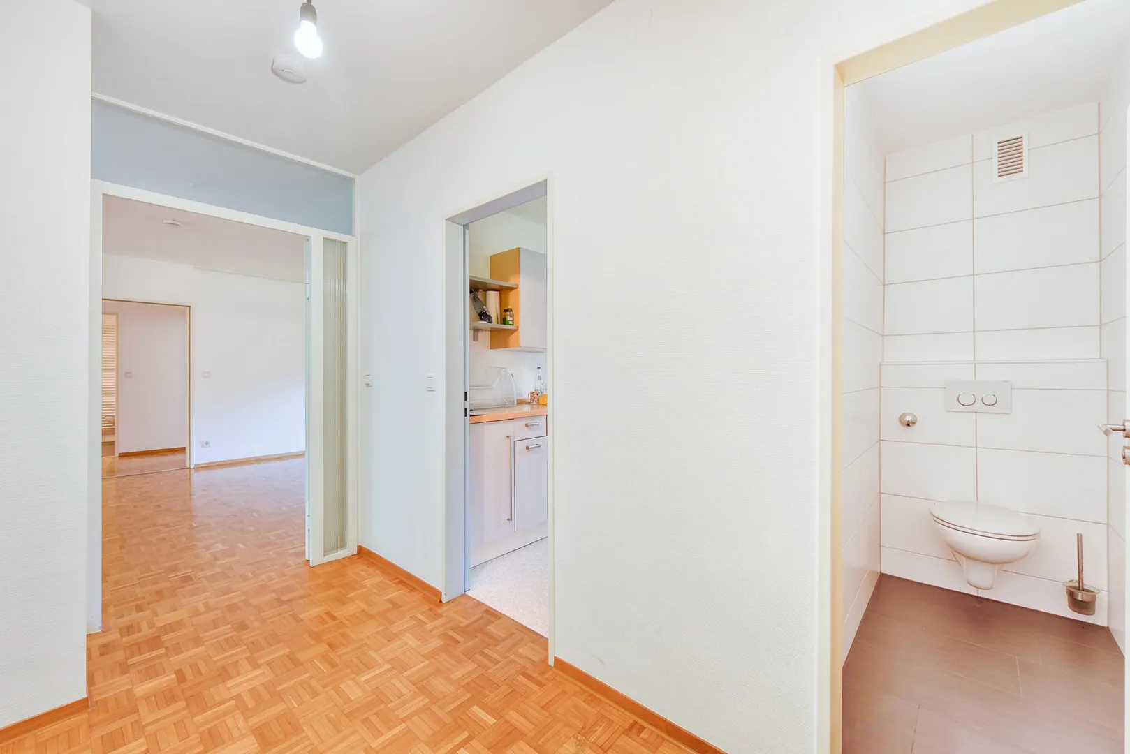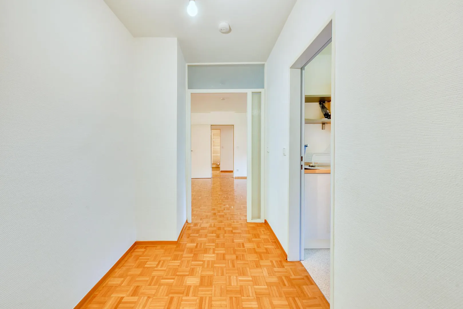 In den Fluren sowie in den Zimmern ist Parkett verlegt. In der Küche ist ein Linoleum-Boden (Naturprodukt) verlegt.