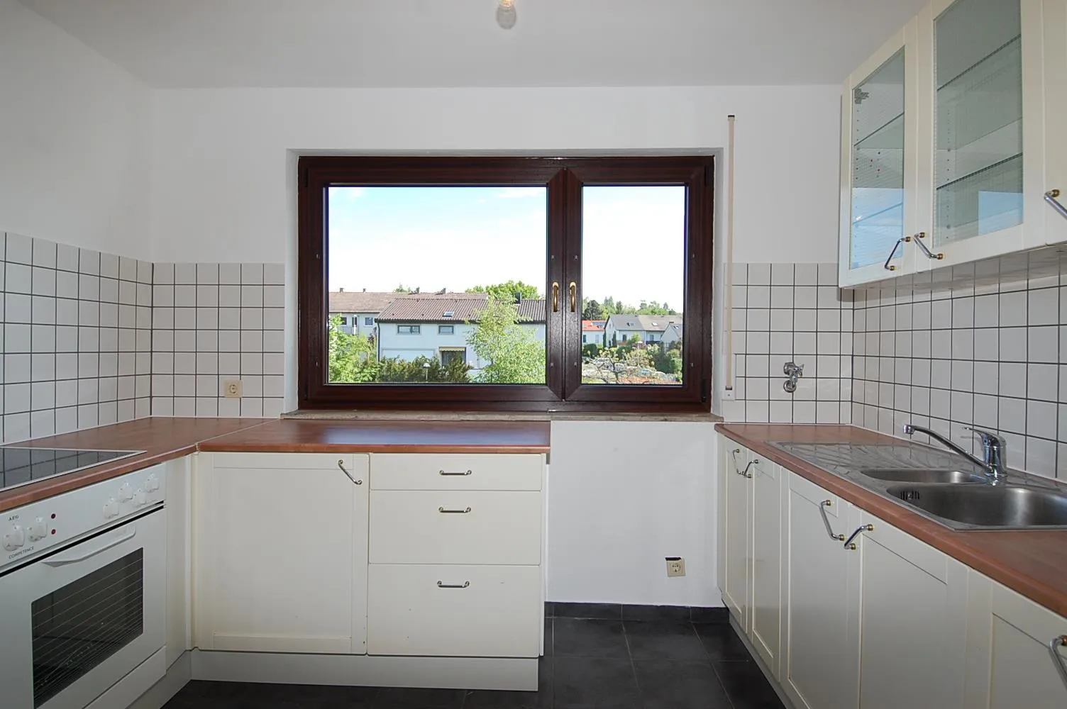 Die Einbauküche ist ausgestattet mit Cerankochfeld und Backofen, Spüle, neuer Arbeitsplatte sowie Stauraum in Ober- und Unterschränken.