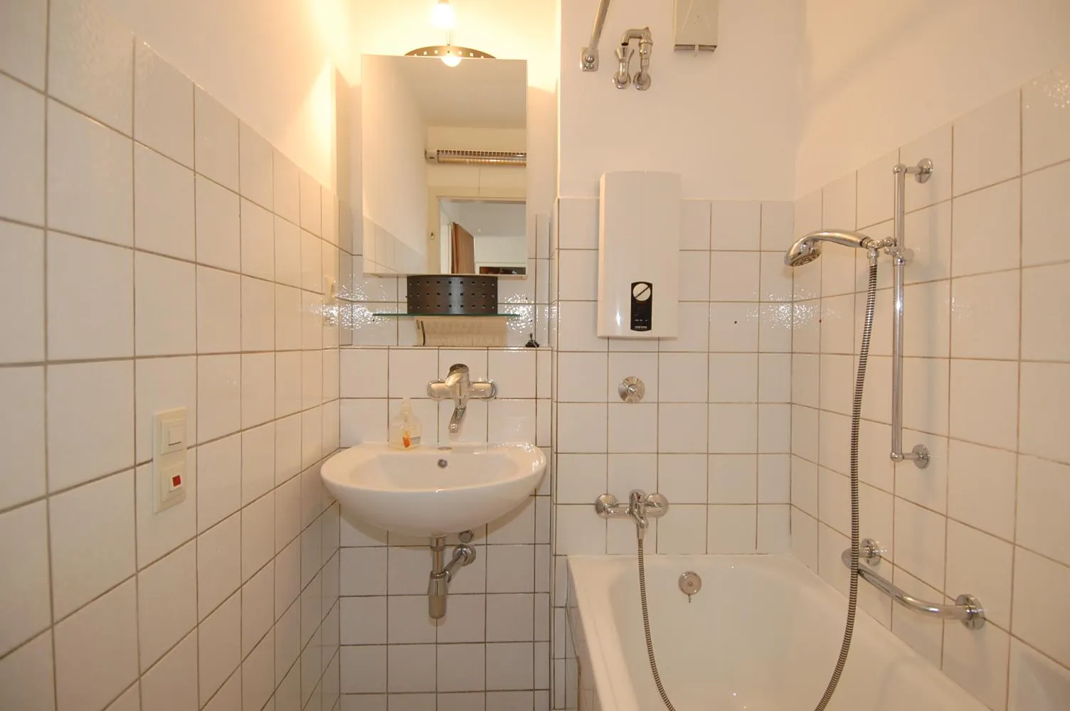 Das relativ kleine Bad ist halbhoch gefliest und mit Badewanne, Waschbecken und Elektroheizer ausgestattet. Das WC ist separat.