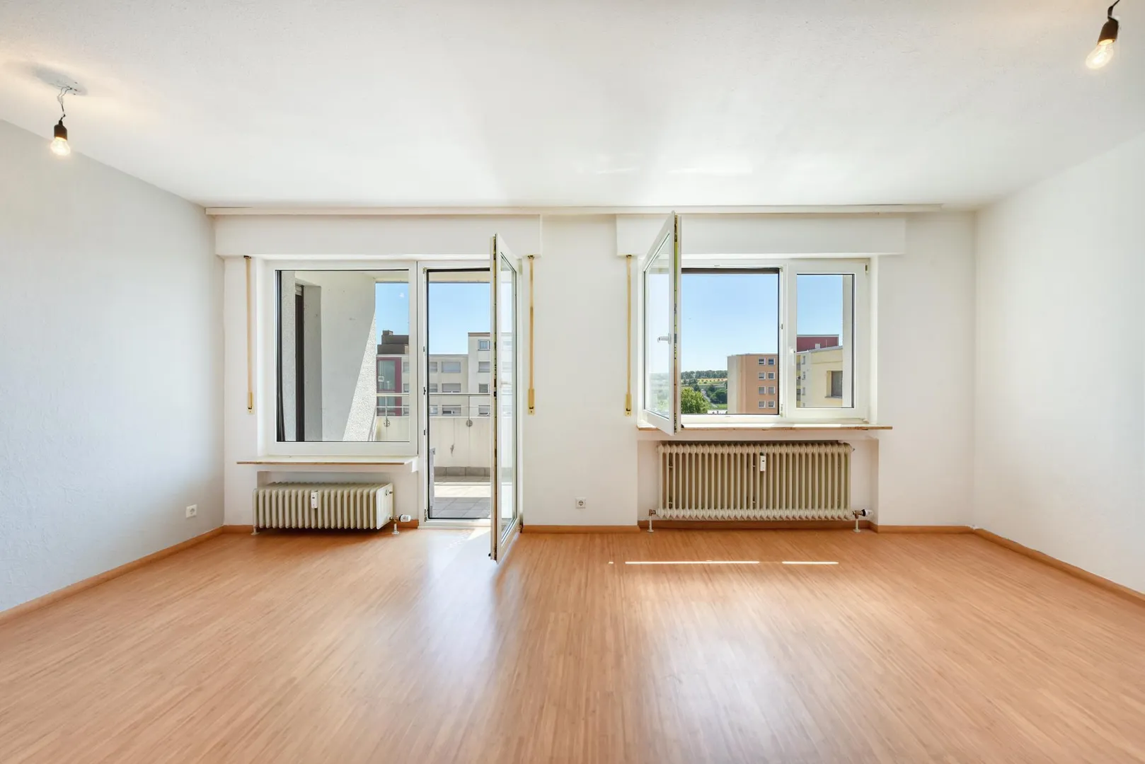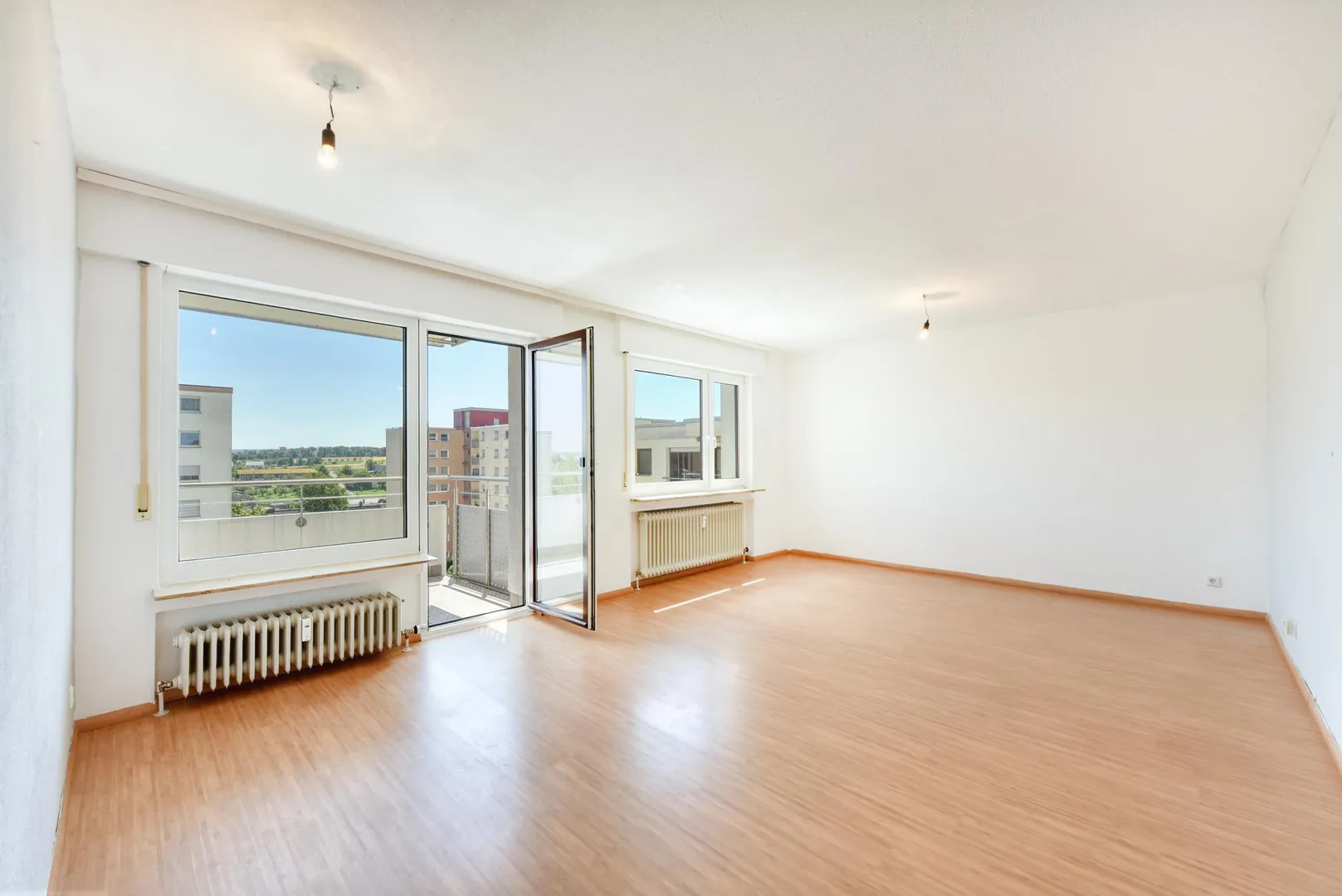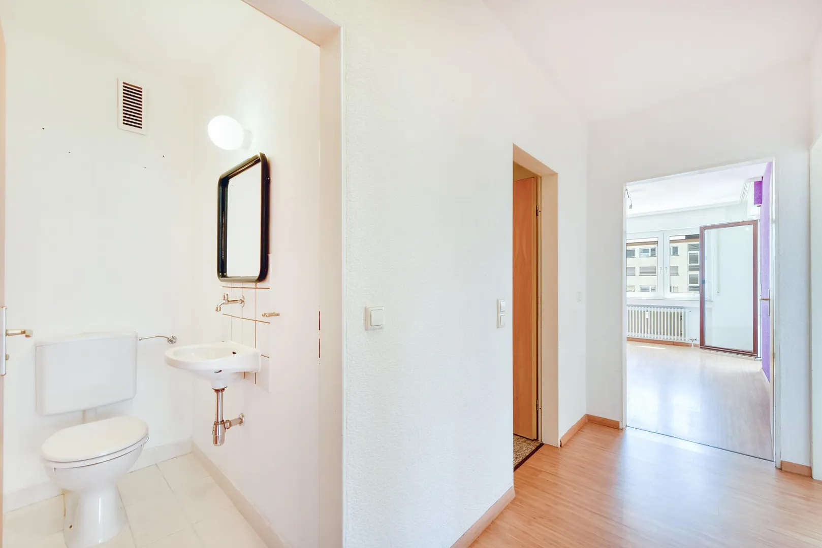 Der Grundriss ist gut: alle Räume sind direkt vom Flur begehbar. Der 4,6 m² große und überdachte Süd-Balkon ist sowohl übers Wohnzimmer als auch übers Schlafzimmer begehbar. Das Badezimmer sowie das separate WC sind innenliegend. In der Wohnung befindet sich ein Abstellraum.