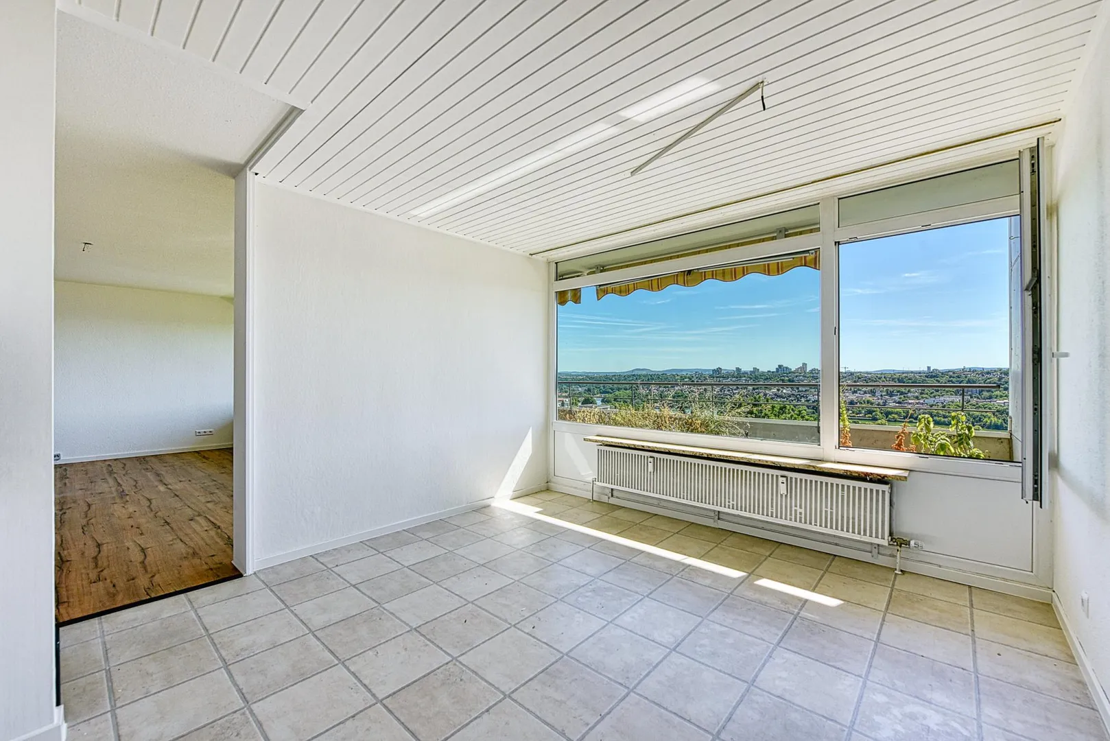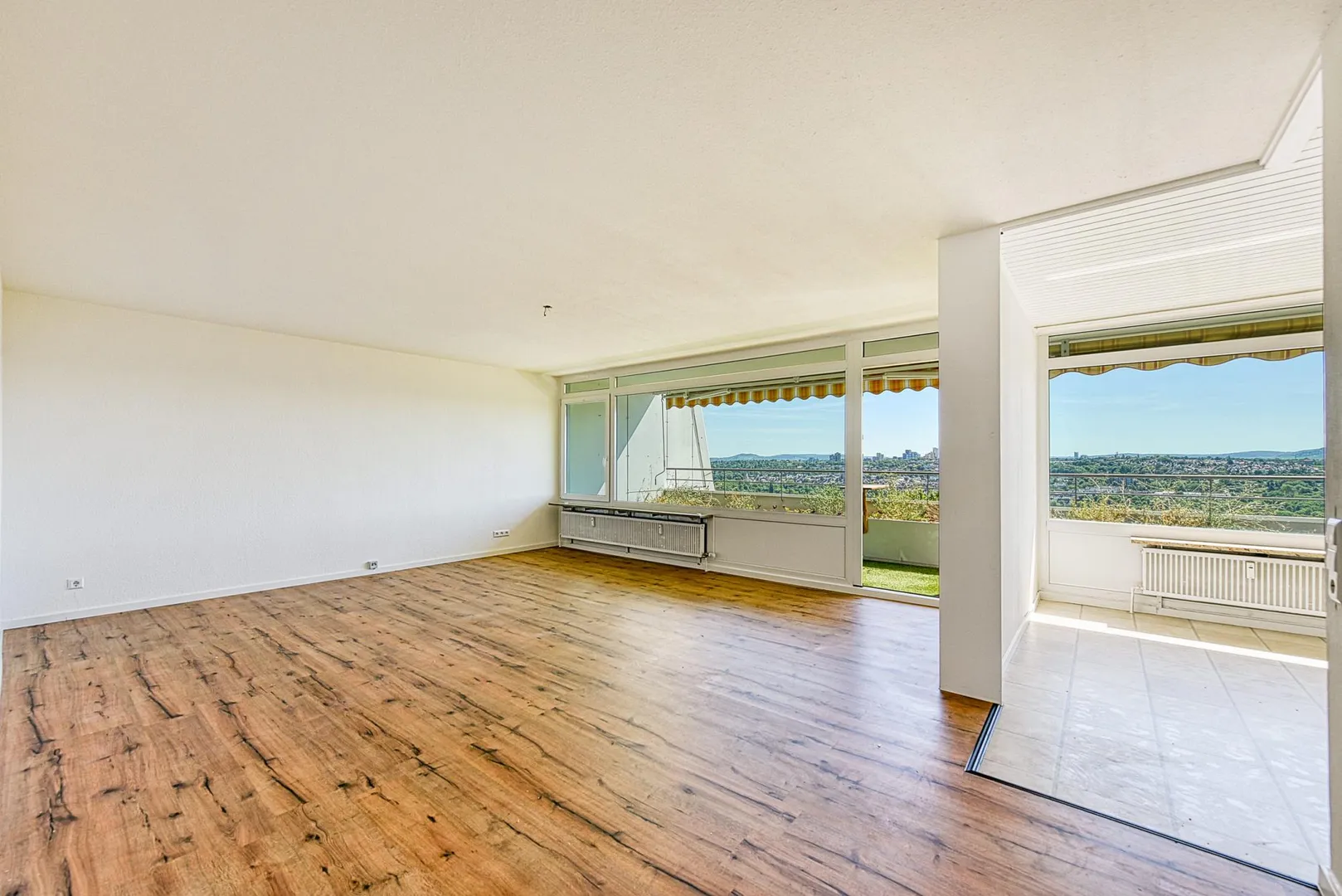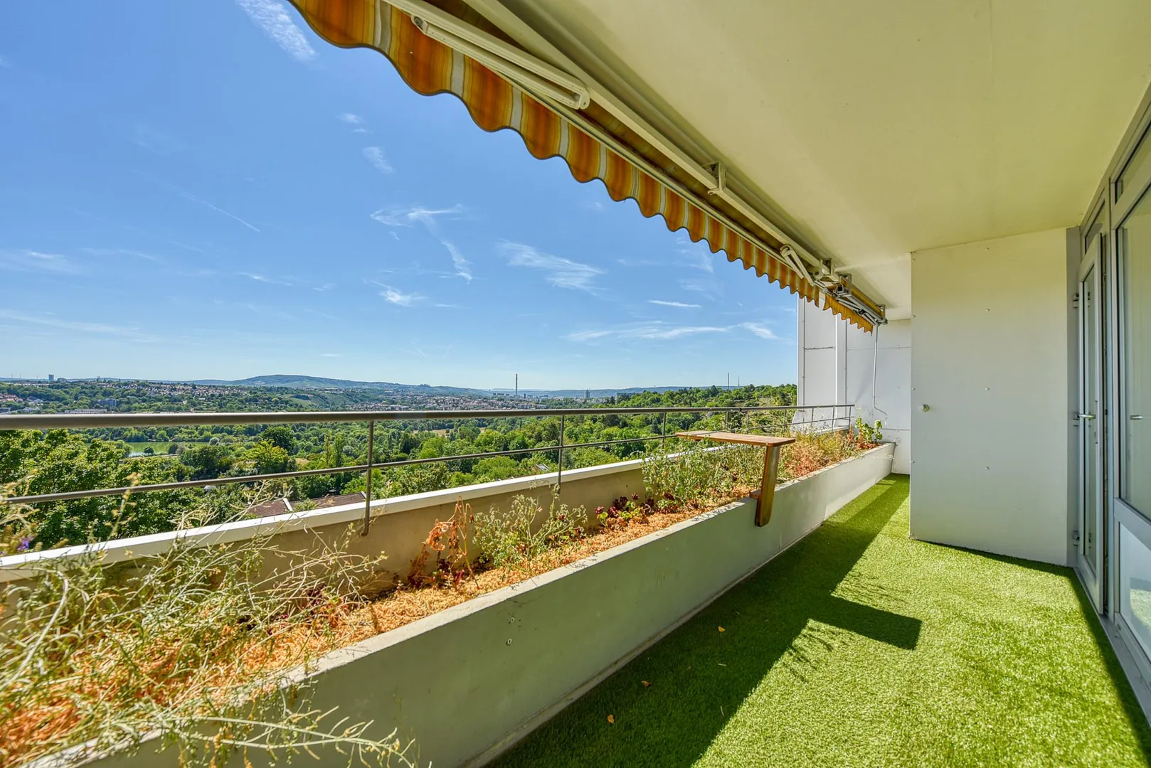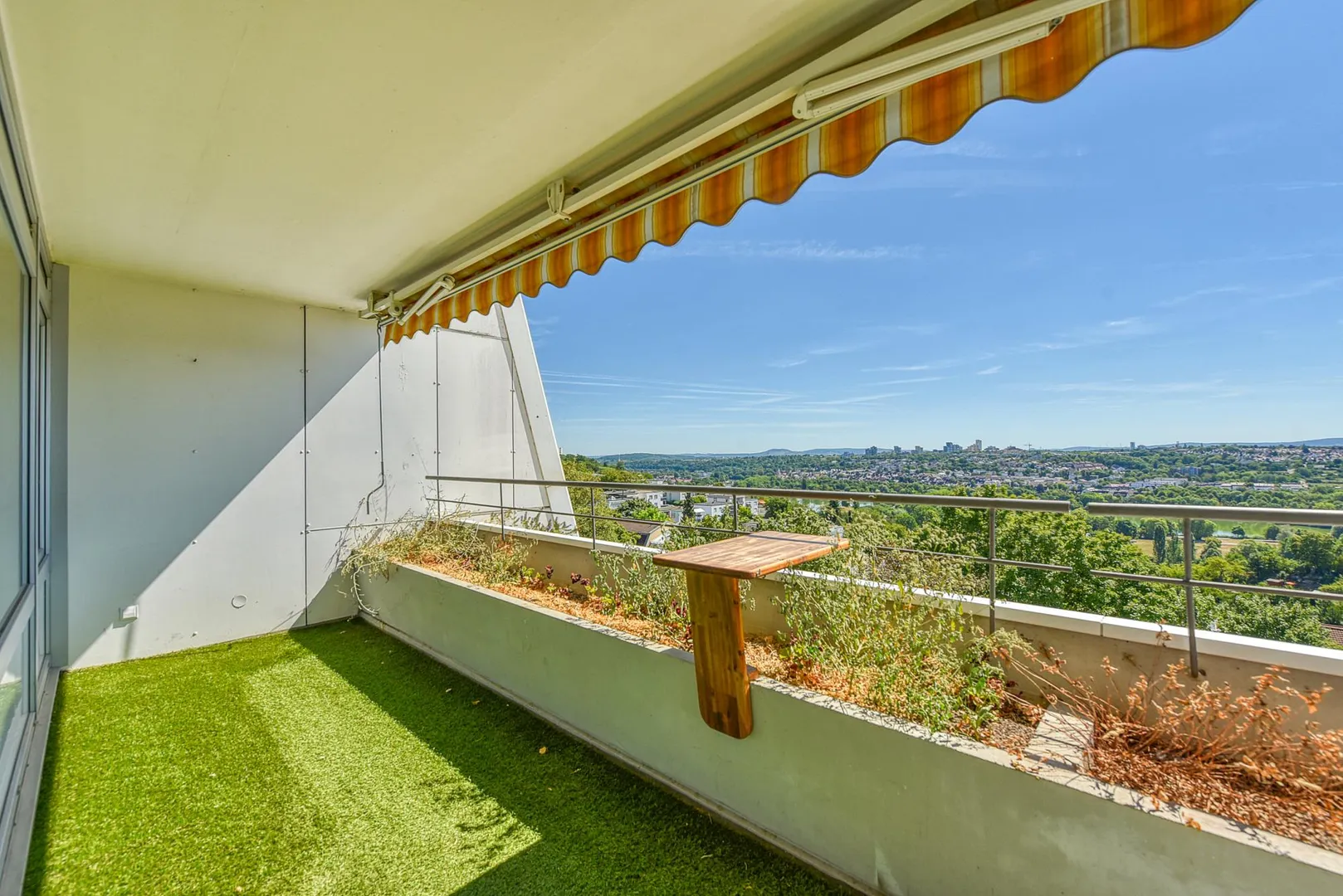Der Balkon zur Süd/Ost-Seite mit Fernsicht ist komplett überdacht und ist mit zwei Markisen und Pflanzenbeet ausgestattet.