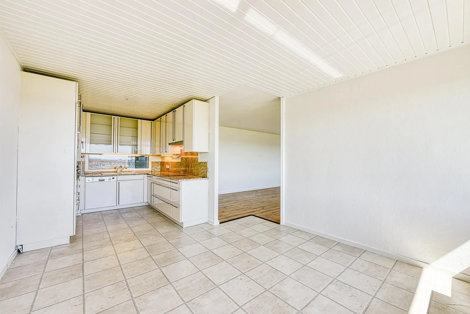 In den restlichen Räumen ist Laminat verlegt. Die Laminatböden im Flur, in der sowie in der Küche sind in Fliesenoptik.