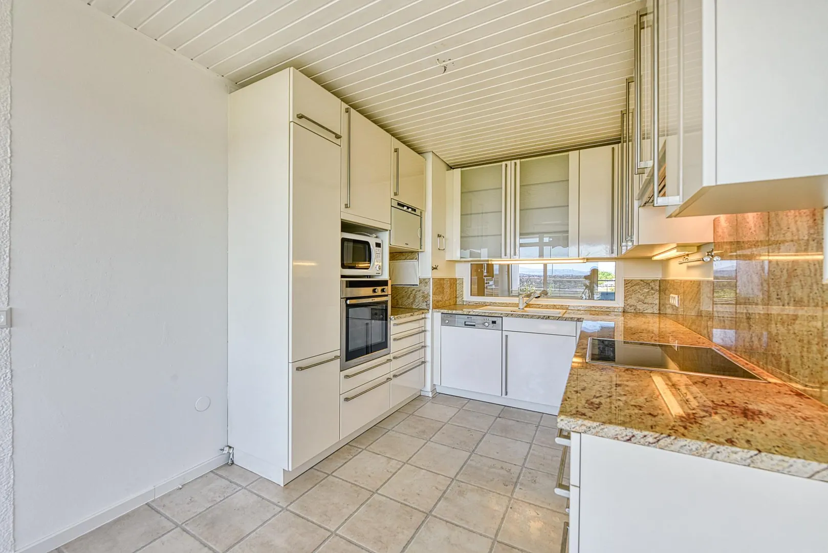 Die Küche ist zum Essbereich offen. Die Küche ist mit einer Einbauküche ausgestattet. Die Einbauküche verfügt über Mikrowelle, Dampfgarer, Backofen, Induktionsherd, Spülmaschine, Dunstabzugshaube, Ober- und Unterschränke. Die Einbauküche ist ohne Kühl-/Gefrierschrank.