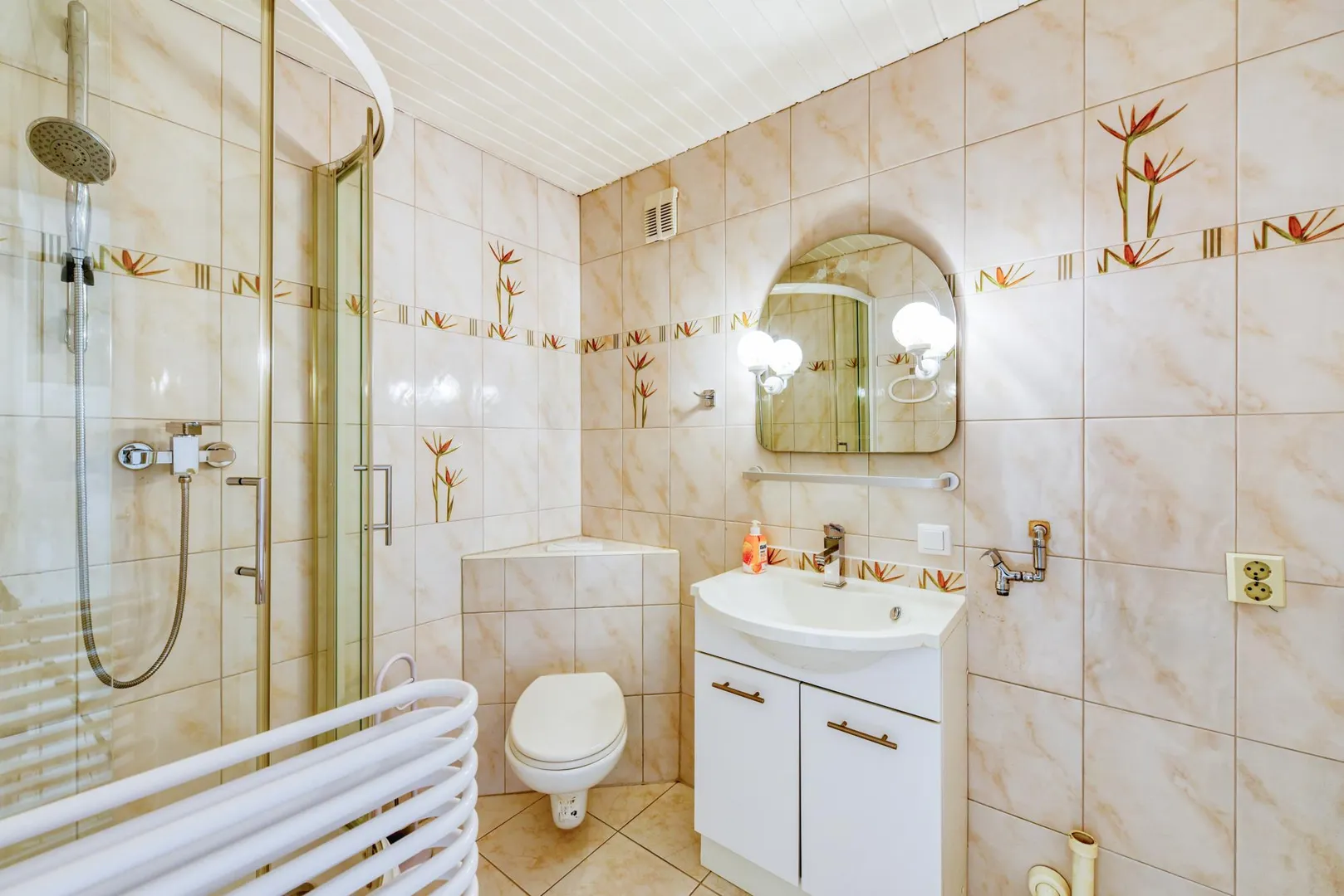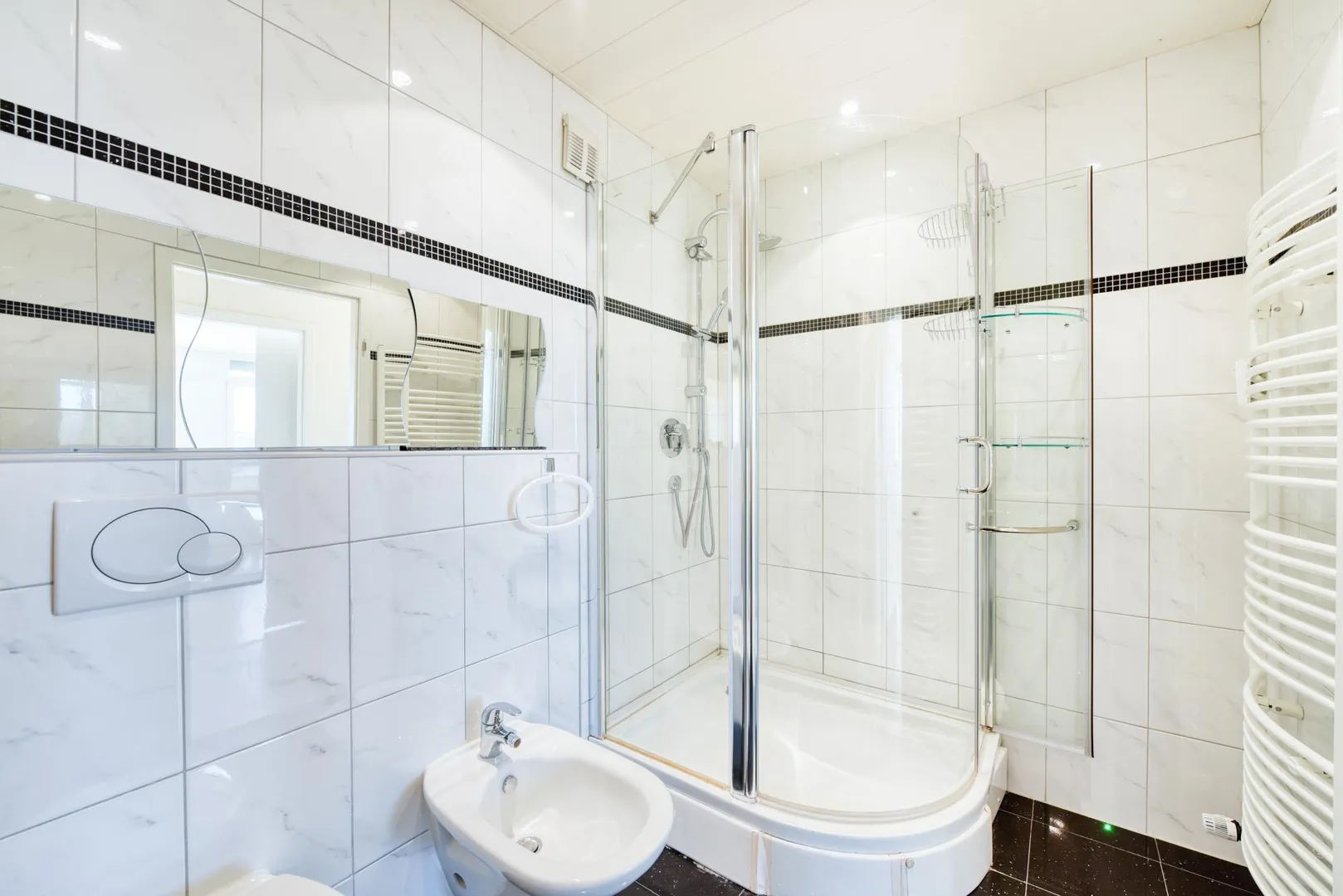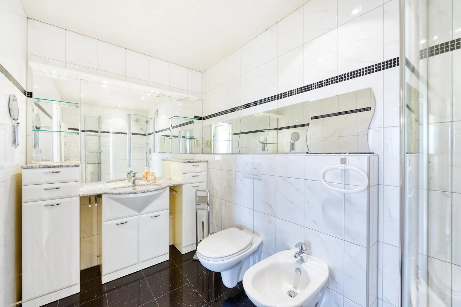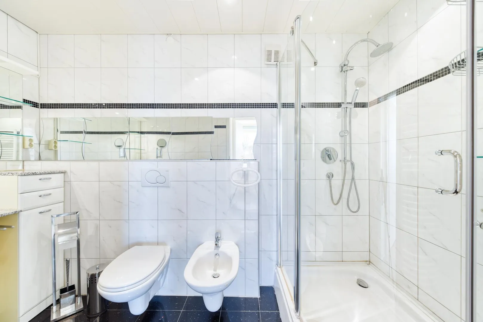 Beide Bäder sind gefliest und sind mit Dusche und WC ausgestattet. Ein Bad verfügt über Waschmaschinen-Anschluss, das andere Bad über ein Bidet.