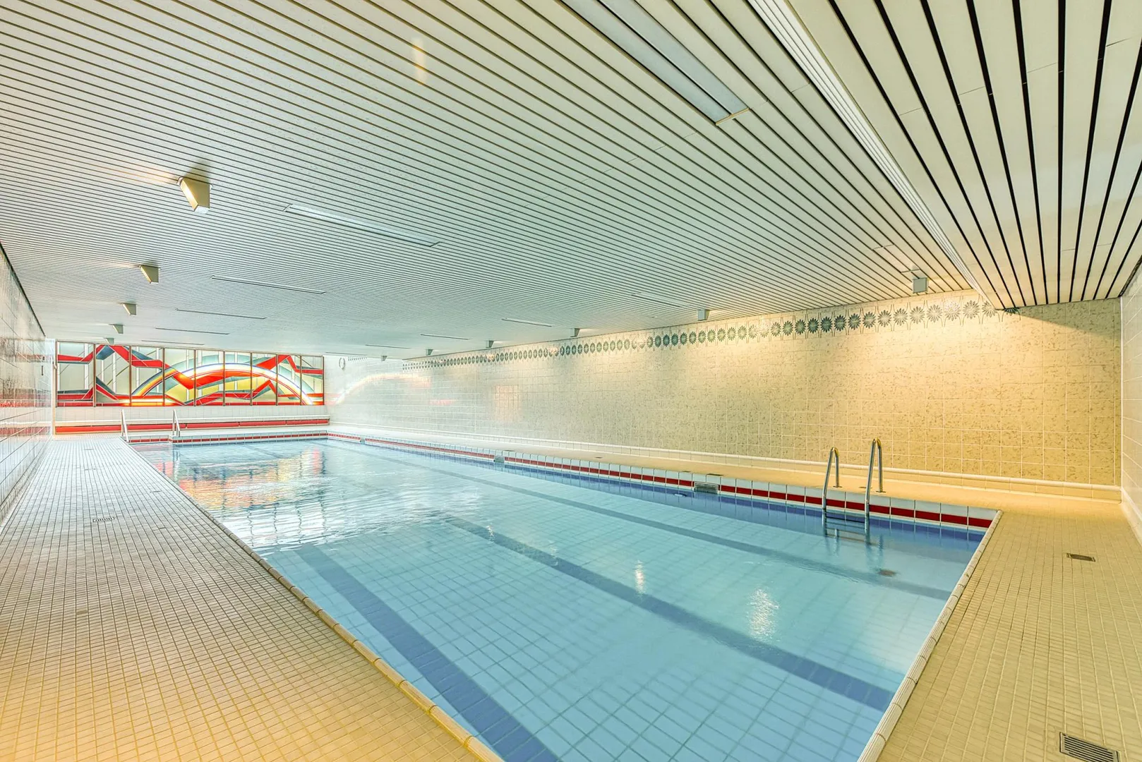 Die "Apollo"-Hochhaus-Anlage wurde ca. 1972, altersgerecht, massiv und mit Flachdächern erbaut; ist 2-fach unterkellert und verfügt im Untergeschoss über eine Tiefgarage, Abstellräume sowie ein Schwimmbad (20-Meter Becken) mit Sauna.